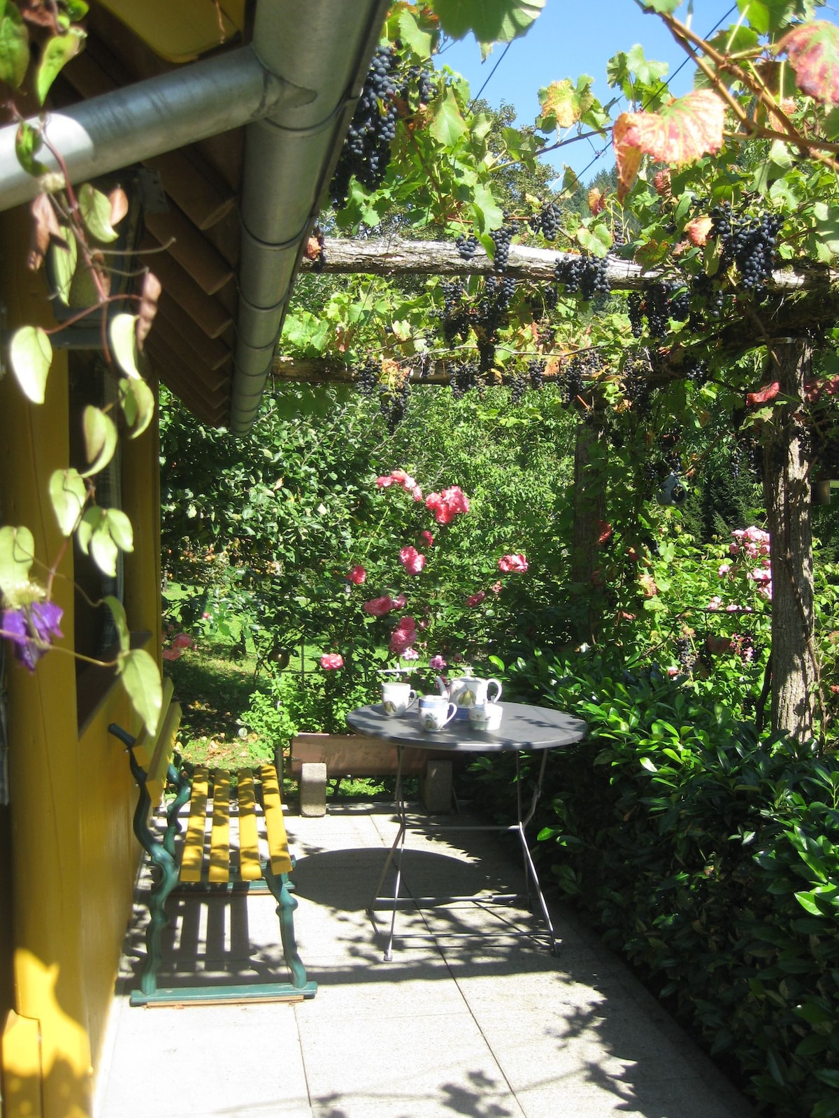 Pequeño pero bonito, el apartamento está situado en el ático de la casa. Desde mediodía hasta el atardecer usted puede disfrutar del sol en el balcón. Este puede ser matizado con un toldo, si usted tiene demasiado calor. El apartamento puede acoger hasta cuatro personas en dos habitaciones. Una, con una cama doble, y otra con dos camas individuales. El salón tiene una moderna cocina con cuatro fogones, horno, frigorífico, lavaplatos, calentador de agua, tostadora y cafetera. La mesa del comedor tiene cuatro sillas y está situada cerca de una ventana luminosa; también tiene un sofá de cuero con dos asientos, los cuales invitan a relajarse o a ver la TV. Por supuesto, podemos proporcionarle una cuna para bebé. Solo tiene que solicitarla. Las sábanas y toallas están incluidas en el precio, y en caso de que quiera usted lavarlas, además puede encontrar una lavadora en el baño. Por favor, tenga usted en cuenta no está permitido fumar en nuestros apartamentos. Alrededor de la casa Todo el mundo encuentra su lugar favorito en nuestro gran jardín. Bien en nuestro patio trasero en el banco de piedra, durmiendo o leyendo en las tumbonas o tomando café en el espacio para sentarse cerca del arenero o en la casa de juegos donde nuestros pequeños invitados pueden disfrutar todo el día. Por la tarde, nuestra pérgola cubierta con las hojas de vid creciendo en la terraza, invita al final del día a tomar una copa de vino o a organizar una fiesta en la barbacoa. Como está de vacaciones y usted no ha venido a trabajar, nosotros hemos equipado la pérgola con platos y carbón para la barbacoa.