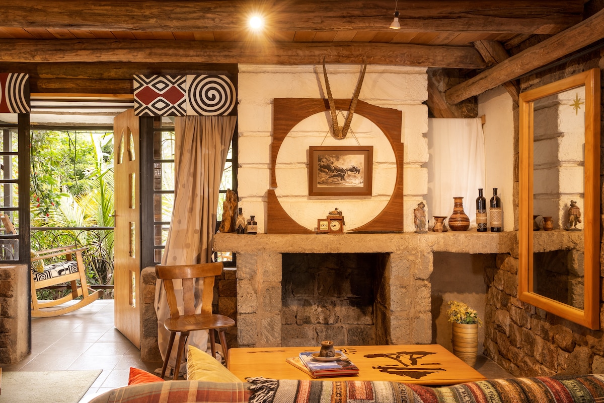 Situada en el corazón del frondoso suburbio de Karen; esta elegante casa de campo alpina de un dormitorio está escondida fuera de la vista en una esquina de nuestro jardín de cuatro acres. Ideal para viajeros solitarios y parejas. No apto para huéspedes con problemas de movilidad. No se permiten niños pequeños debido a la empinada escalera. La propiedad se encuentra a menos de 1,5 km del centro comercial Hub y a solo 2 km del centro Karen.