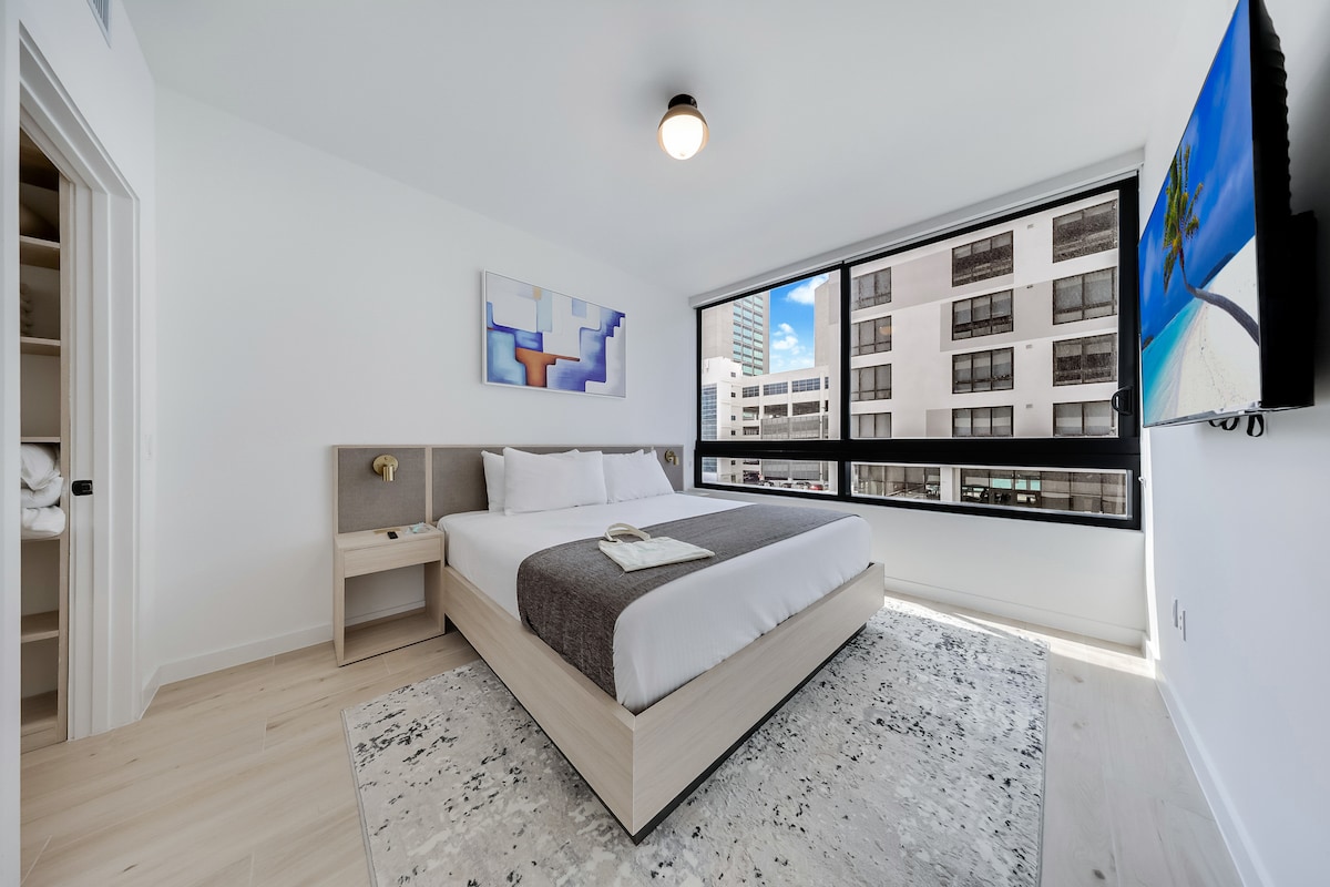 Hospédese en una unidad de lujo completamente nueva de 1 dormitorio, 1 cocina y 2 baños en el corazón del centro de Miami, en el recién inaugurado 501 First Residences (2026). Este espacio moderno puede alojar cómodamente hasta 5 huéspedes y cuenta con una cocina totalmente equipada y un balcón privado. Disfrute de servicios de nivel hotelero, como piscina en la azotea, gimnasio y áreas de descanso. Ubicado en una ubicación privilegiada, a pocos pasos de restaurantes, tiendas y lugares de entretenimiento. Ideal tanto para estancias de negocios como de placer.