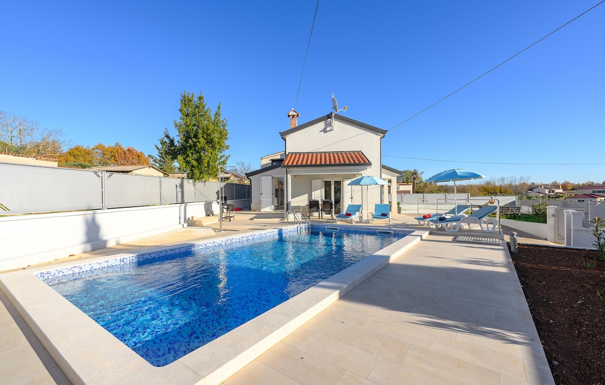 Villa Mariva is a contemporary holiday house with heated pool, located in the peaceful and quiet surrounding of the village Kaštelir, on the western coast of Istria peninsula, just 8 kms from the coast. It is situated on a hill and it gives a beautiful view of the sea and all the surroundings. The villa is just 10 kms away from Poreč and 8 kms away from aquapark Istralandia.
