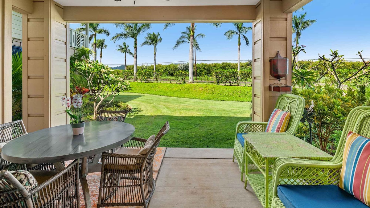 Remodeled ground floor, corner unit in exclusive Bld 11. Steps from beach! Whole home A/C (dual split in living room & window unit in bedroom). New cal king bed, queen sleeper sofa & mini twin in the living room. Sleeps up to 5. Super fast wifi. Private lanai steps out to expansive gardens & Twin Bridges. New living & dining furniture! 65” Smart tv. Unit is supplied w/extra amenities, suggested experiences & babysitting recommendations around the island to offer a fantastic & unforgettable stay!