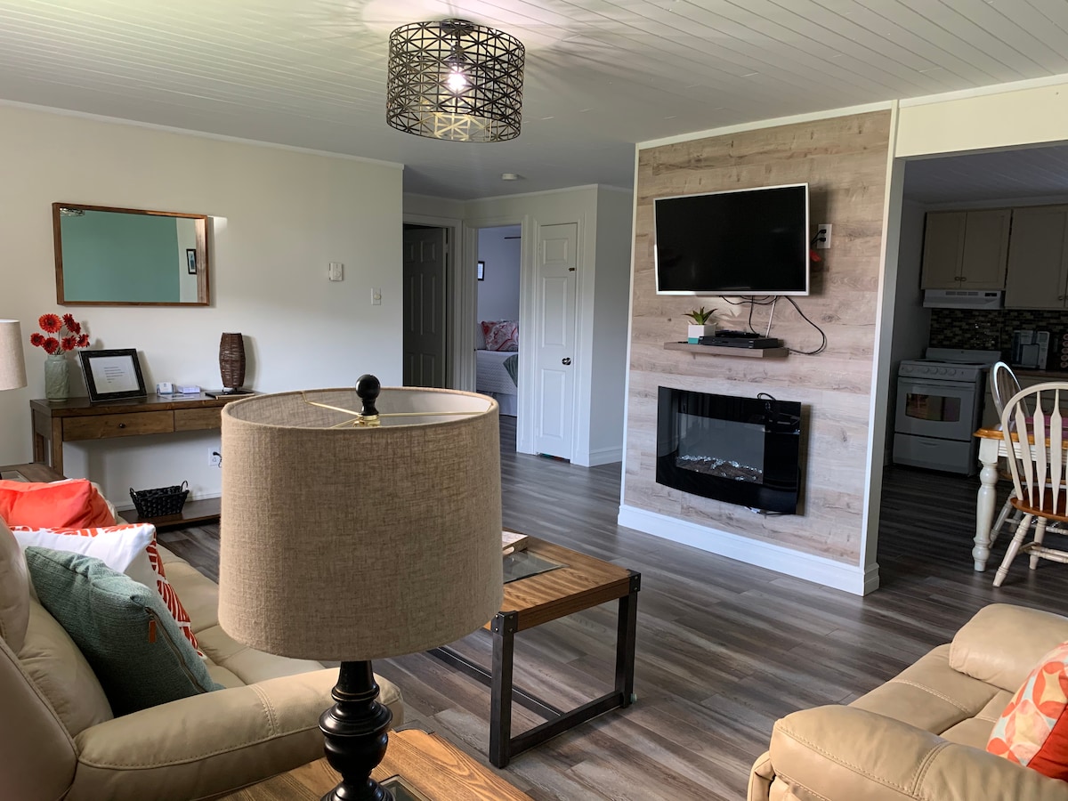 CONCEPTO ABIERTO unidad de un dormitorio con una cama tamaño queen y un sofá cama doble extraíble... cocina totalmente equipada... baño de 3 piezas... Internet inalámbrico... TV por cable... patio compartido... y nuestras joyas más nuevas, un sitio de fogata compartido con asientos adirondack y una bañera de hidromasaje compartida para 7 personas, ambos ubicados en el patio trasero... alquiler diario, semanal o mensual... servicio de lavandería disponible... mascotas bienvenidas... cerca del supermercado local, licorería, pub local, restaurantes, farmacia, parque infantil con almohadilla de chapoteo...