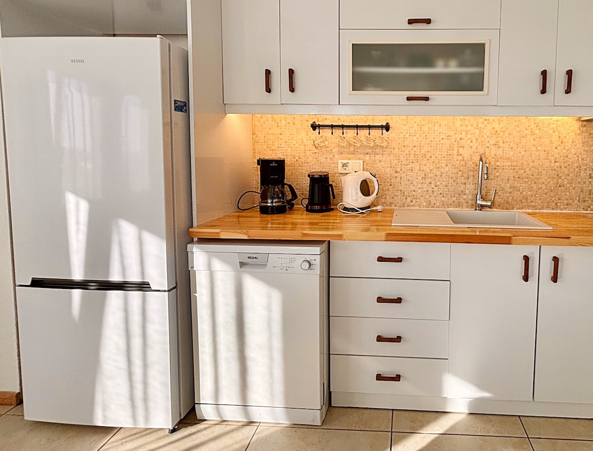 Nuestra casa tiene una superficie de 60 m2 y está distribuida en 1+1. Tiene una terraza bastante grande de 40 m2, y hay materiales para barbacoa en el jardín. Dormitorio: 1 cama doble, 1 armario abierto, mesa de maquillaje y silla. Hay un gran sofá en el salón. Cocina; cocina abierta, salón y todos los materiales básicos disponibles. Hay 1 baño con inodoro. Ofrecemos un alojamiento cómodo para 2 personas.