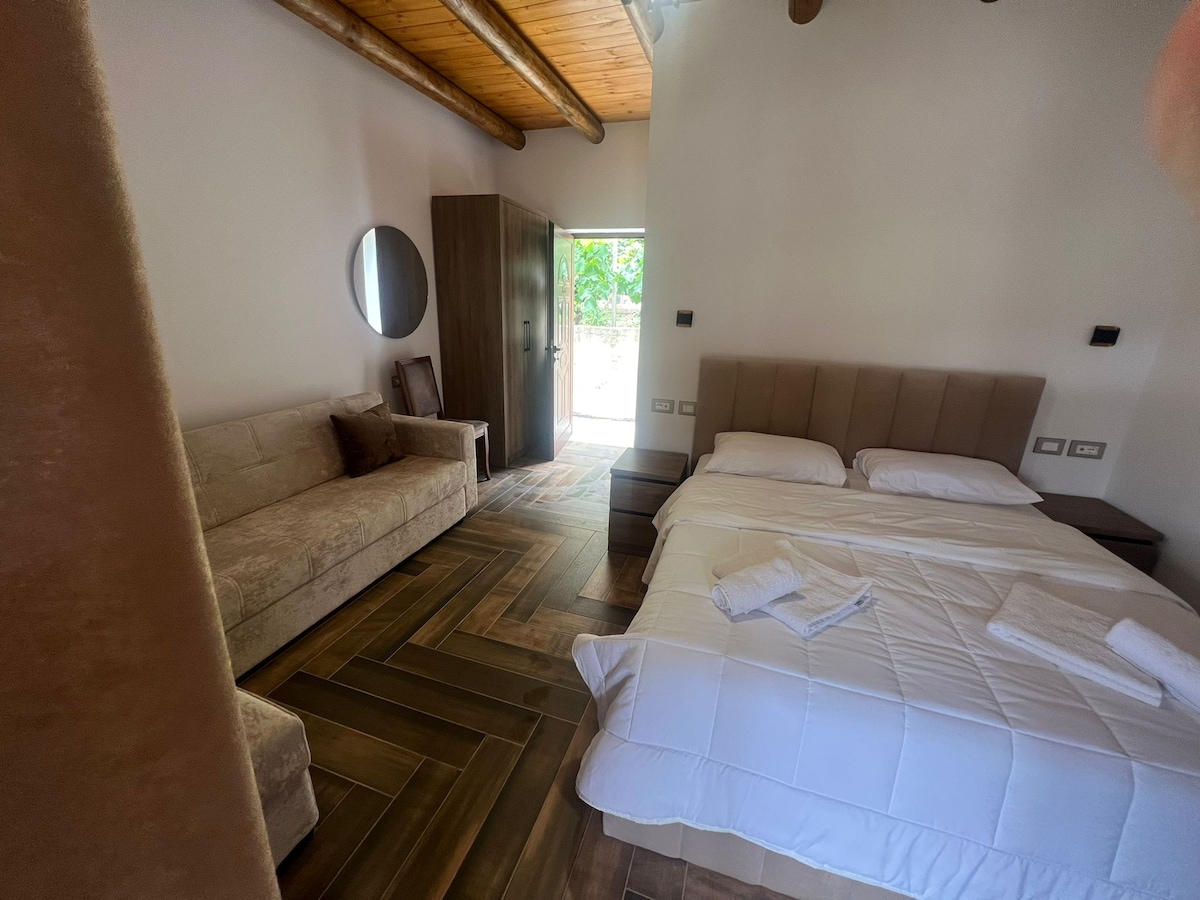 Si buscas absoluta tranquilidad y comodidad, este moderno bungalow totalmente equipado, situado en un viñedo a las afueras de la famosa ciudad de Gjirokaster en un hermoso valle rodeado de naturaleza y vistas increíbles de las montañas y de la ciudad es para ti. Cuenta con cama king size, cocina totalmente equipada, lavadora de ropa, lavaplatos, baño privado e internet de alta velocidad. Hay dos bicicletas para los huéspedes y estacionamiento dentro de la propiedad sin costo alguno.