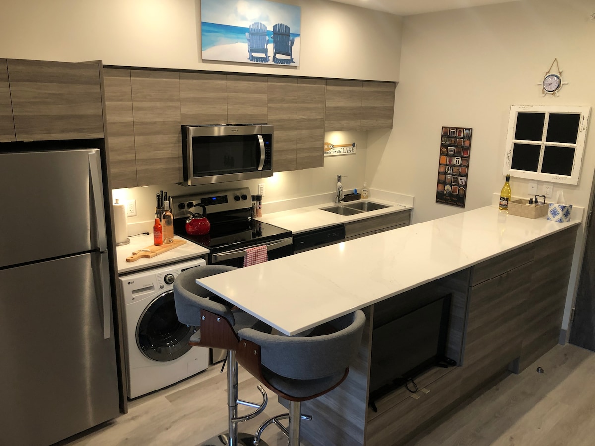 Suite moderna en el sótano a nivel del suelo con luz natural y cocina grande totalmente equipada. Aire acondicionado para el verano, horno para el invierno con chimenea eléctrica y calentadores adicionales en cada dormitorio para asegurarte de que siempre estés cómodo. Espacio bien iluminado con persianas celulares. Puerto USB en cada lámpara para mayor comodidad. Internet rápido de 100 mbps y televisión inteligente con acceso por cable o servicios de streaming. La cocina tiene electrodomésticos de tamaño completo, sistema de filtro de agua y una máquina de hielo en el refrigerador.