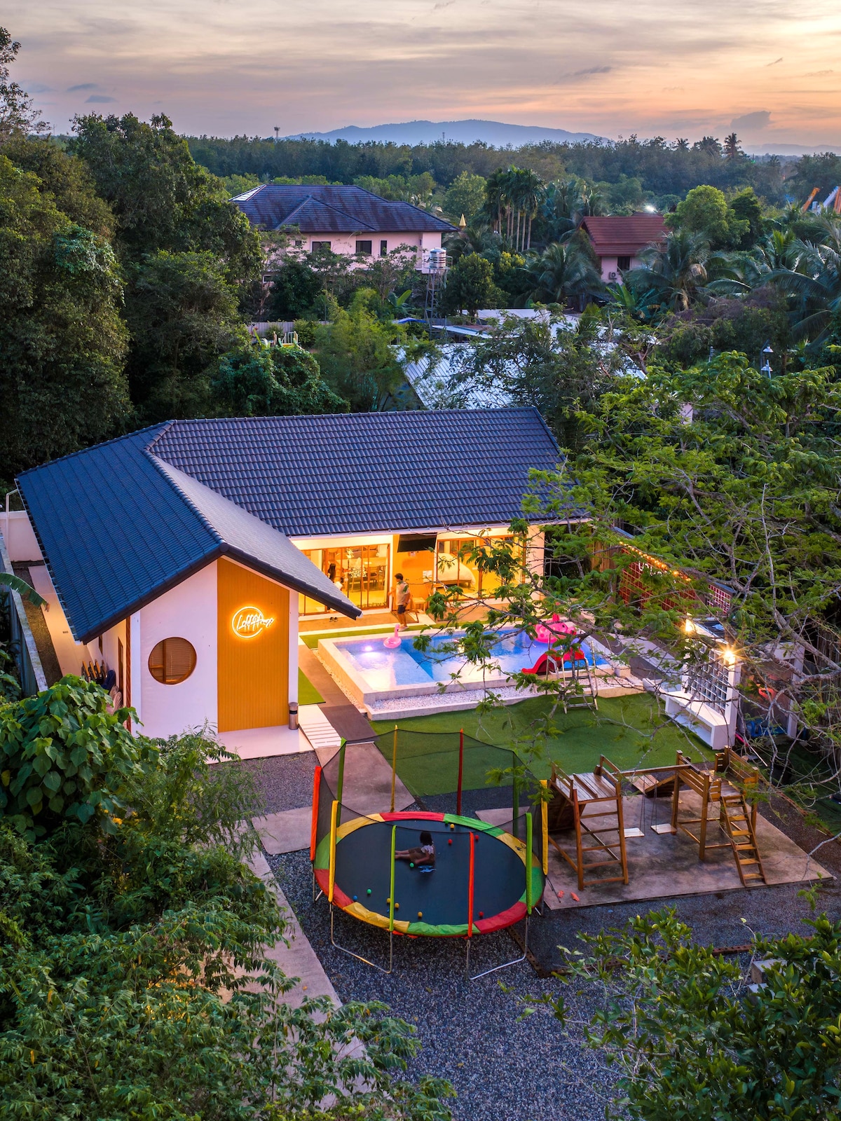 Un lugar para alojarse y actividades para toda la familia cuando te hospedes en un lugar en el corazón de la ciudad cerca Mercado nocturno pequeño/7-11 200 m Centro comercial comunitario Hatyai Village a 1 km Festival central de Hatyai a 5 km. Universidad Príncipe de Songklah a 2,8 km Mercado de Kimyong/jardín Lee a 3,5 km Big-C Extra 1,6 km Vida espaciosa Actividades al aire libre Jacuzzi/barbacoa/Zona de juegos para niños Aire acondicionado, TV de pantalla grande de 65pulgadas, wifi fuerte, Netflix/Disney hotstar gratuito. Estacionamiento para 3 autos. Hay una cocina halal. Totalmente equipado. Acogedor, cómodo, privado, tranquilo. Un hogar lejos de casa.