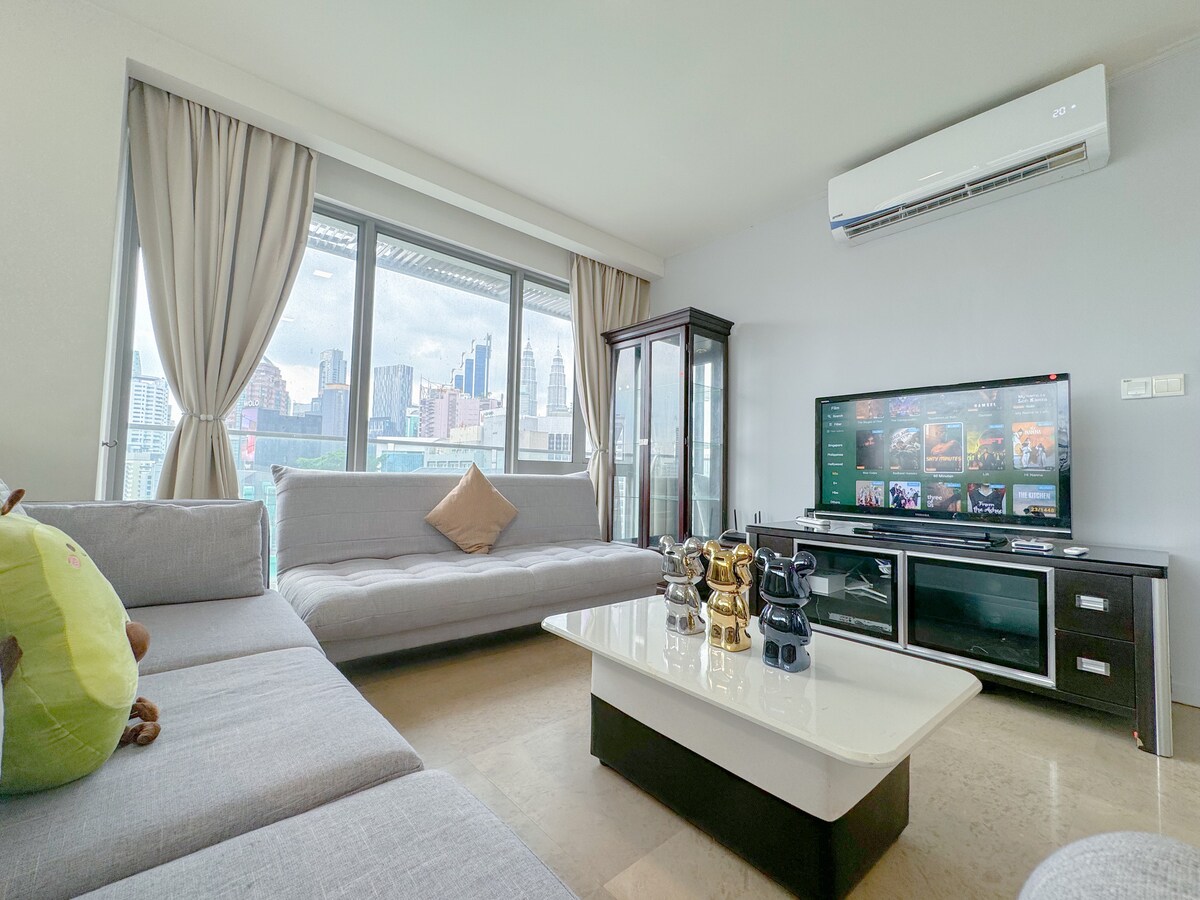[UBICACIÓN PRIVILEGIADA] ¡VISTA AL KLCC Y A LA CIUDAD! Apartamento moderno y cómodo ubicado justo en el corazón del distrito comercial de KL, ¡a poca distancia a pie de todos los famosos centros comerciales y restaurantes de KL! ¡Relación calidad-precio y perfecta para una familia económica! 2 dormitorios, 1 baño (puede alojar hasta 6 personas). Piscina (acceso gratuito), gimnasio (solo para huéspedes para estancias largas) A 2-4 minutos a pie del pabellón, Lot10, Farenheit88, Starhill, Bukit Bintang Monorail Station, Jalan Alor Food Street