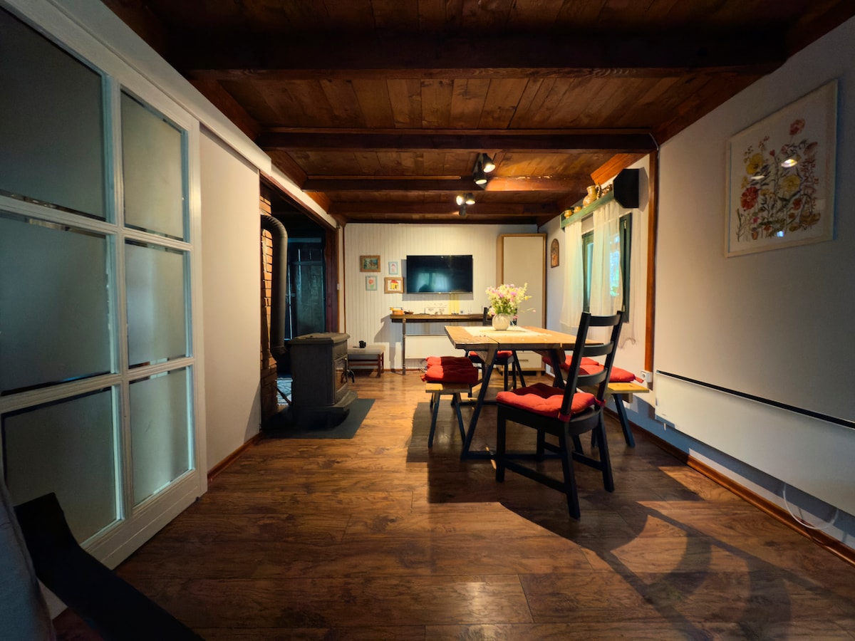 La cabaña está construida con materiales naturales, siguiendo principios sostenibles, y forma parte de un hogar rural tradicional, cerca de alimentos caseros y animales de granja. No hay cocina, pero ofrecemos comidas de nuestro menú que puedes elegir según sea necesario. Cuenta con TV, wifi y un escritorio grande para dos. Un regalo especial es un descanso por la tarde en la bañera incorporada con vistas al bosque.
