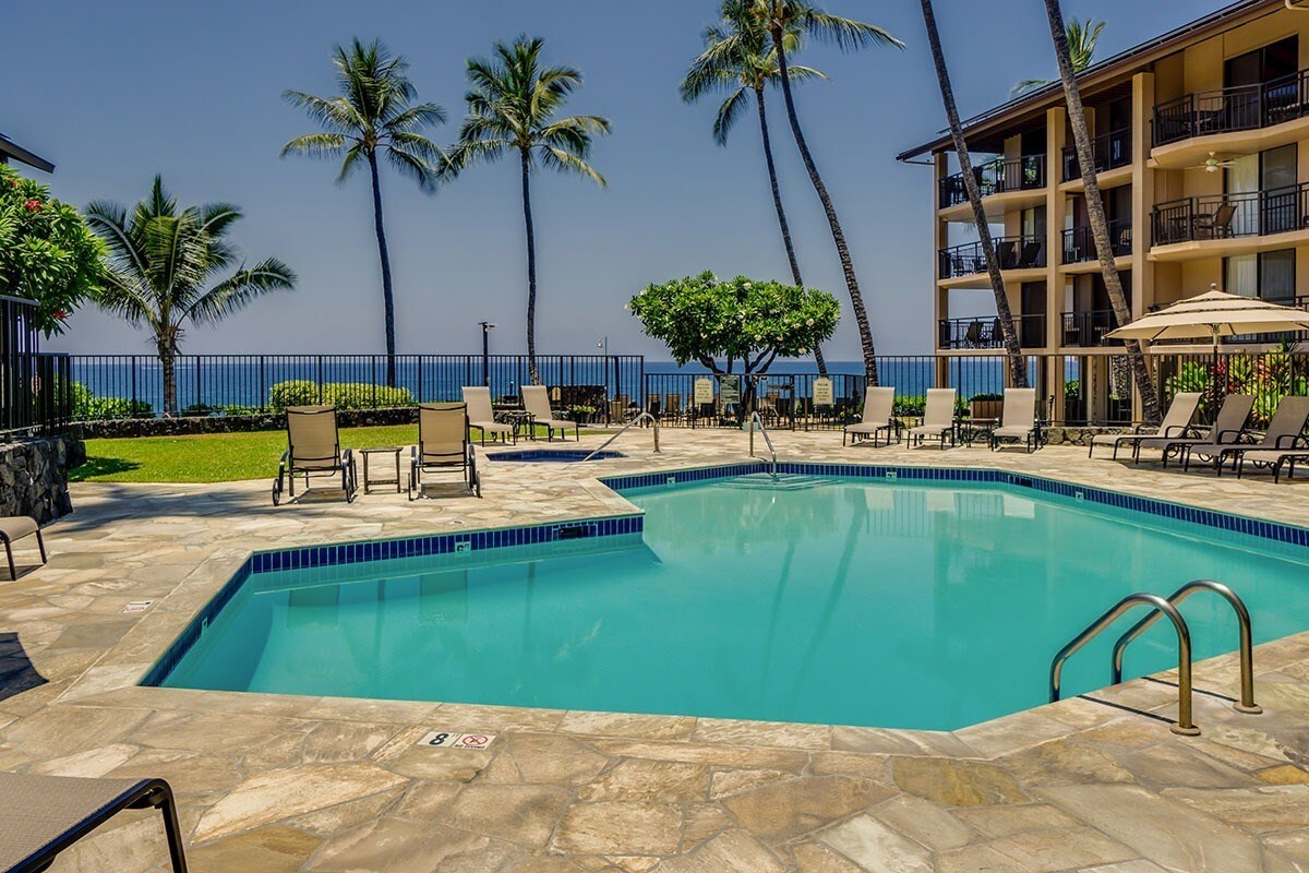 El choque de las olas te adormecerá en nuestro espacioso apartamento de 687 pies cuadrados con vista al mar. A unos pasos del agua en el tropical Ocean Front Kona Makai. Nuestro apartamento en el segundo piso tiene capacidad para 4 personas con una cama tamaño king en el dormitorio y un sofá cama tamaño queen extraíble en la sala de estar. 2 aparatos de aire acondicionado + ventiladores en cada habitación para mantenerte fresco. Lavadora y secadora en el apartamento y cocina completa. Piscina y spa. Hermosas vistas al jardín. Preciosas vistas al mar desde la cocina y Lanai para disfrutar de la puesta de sol de Kona o bajar a los acantilados de lava para cenar al atardecer. ¡Las fotos no le hacen justicia!