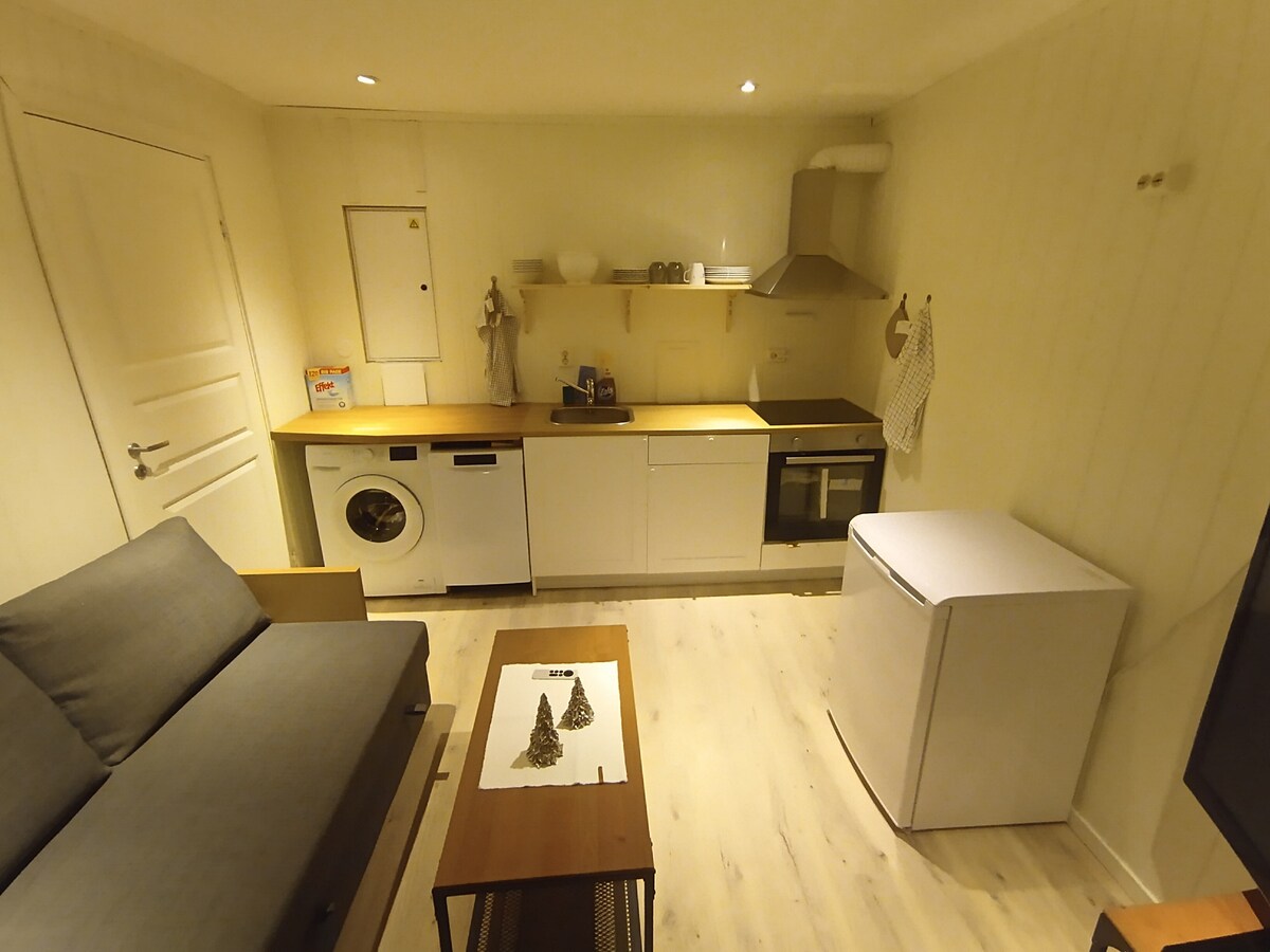Litet, enkelt innredet med ett soverom (2 enkeltsenger, 1 sovesofa 140 cm), rom med tekjøkken (ikke stekeovn eller kjøkkenvifte - steking må unngås), spiseplass, baderom med dusjkabinett og gulvvarme. Varmepumpe som både kan varme og kjøle. Rolig boligstrøk. Det er greit å vite at fra klokken 9 er høner og hane ute i sin luftegård. Sengetøy og håndklær finnes og kjøkkenet har vannkoker, kjøleskap, komfyrtopp, mikrobølgeovn. Vi står for renholdet etter ditt opphold.