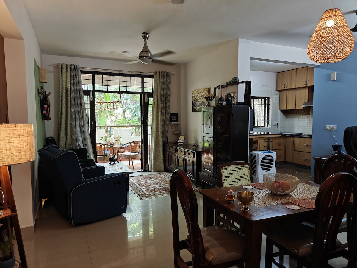 Nos encantaría hospedarte en nuestro 1 BHK (EARTHY Homestay) que combina estilo con un ambiente terroso y tranquilo y panoramas inmejorables. - Balcón Oasis: vistas al bosque + puestas de sol cinematográficas a 200 m - Prime Locale: 2 minutos a NIFT y 3 minutos a las cafeterías, boutiques y comida callejera de 27th Main - Interiores serenos: cama tamaño queen, iluminación ambiental y exuberantes plantas vivas - Trabajo y ocio: wifi de alta velocidad, TV grande y aire fresco Disfruta de estilo, serenidad y puestas de sol espectaculares, ¡todo en un acogedor refugio! - 5ª planta (sin ascensor)