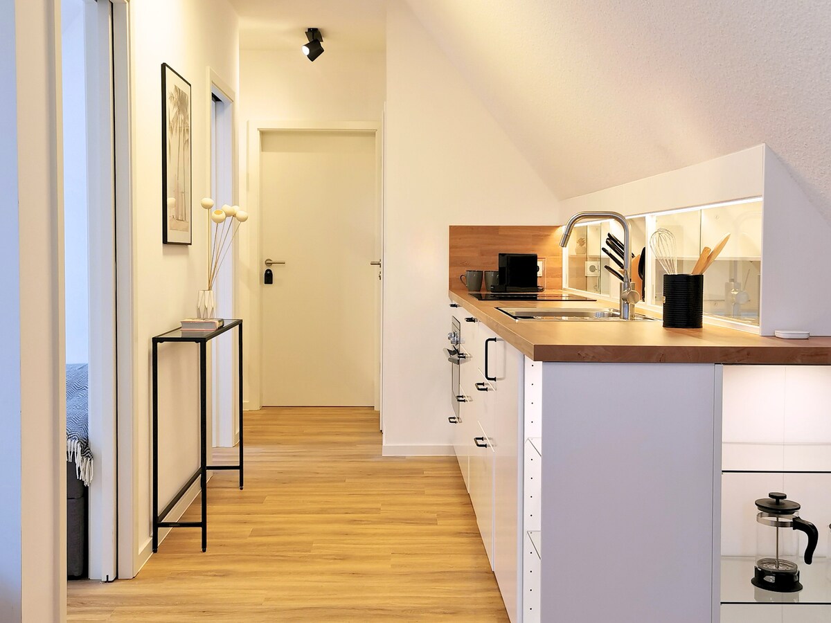 Nuestro exclusivo apartamento de vacaciones Wellenfunkeln es el lugar ideal para sus vacaciones de ensueño en el Mar Báltico. Tiene un ático moderno lleno de luz y elegantemente amueblado con 2 balcones y vistas directas al lago. El apartamento de 72 m², terminado en 2019, se encuentra en el segundo piso/ático en la villa de apartamentos de nueva construcción "Strandperle" con un total de 7 unidades residenciales y está a solo unos 200 m de la playa.