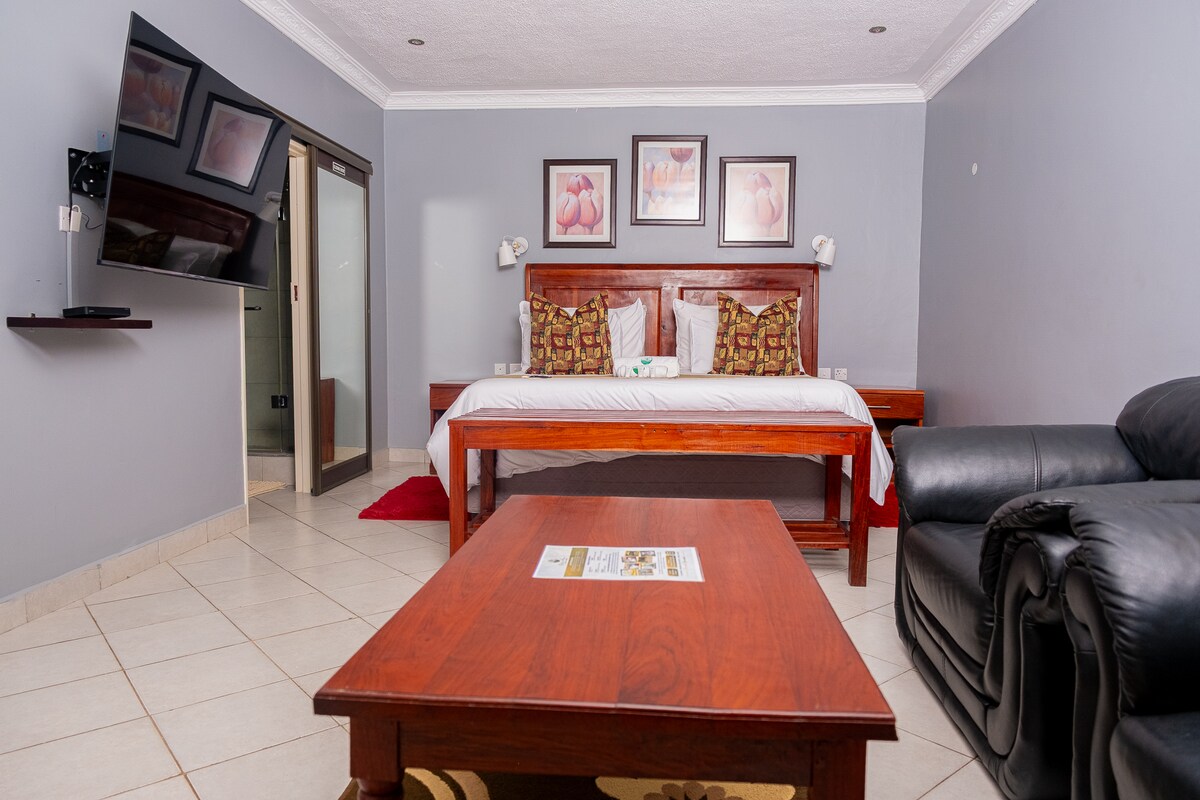 Habitación moderna y elegante en Golden Acres Guest Lodge Cena en nuestro restaurante Duerme en sábanas de algodón egipcio de 400 hilos de primera calidad Entretenimiento inteligente e internet de alta velocidad incluidos Entorno seguro y tranquilo cerca de las atracciones de la ciudad Ideal para noches tranquilas y estancias sin estrés
