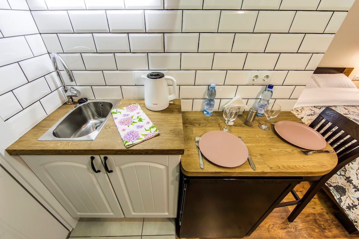 Nos complace presentarle un hermoso estudio tipo hotel en un edificio histórico, construido en 1905 año, ubicado en el centro histórico de la ciudad y está en la lista de monumentos arquitectónicos. Ofrecemos a nuestros huéspedes unas vacaciones en apartamentos nuevos, después de la renovación, con techos altos y un patio tranquilo. Salón bien diseñado con una cama grande, un mini kittchen compacto equipado. El diseño está creado para su comodidad y calidad. 43 "ELED-Smart TV con TV por cable, Internet, WIFI