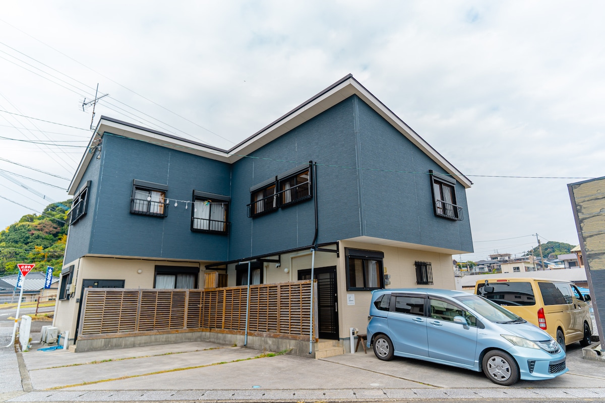 Estamos registrados en el Ministerio de Salud de Japón.: 宮保衛指令第104号 Nuevo y moderno apartamento de dos dormitorios adecuado para una familia o hasta cuatro adultos. A tres minutos a pie (una calle atrás) de la playa de Aoshima, cerca del campo de golf. Ubicación tranquila. Wifi, acceso a Chromecast, cocina completa, aparcamiento. A 8 minutos a pie de la estación más cercana. Utensilios de cocina, cocina de gas, horno de microondas. Espacio para guardar tu equipo de surf/deportivo. Si vienes por trabajo, no dudes en ponerte en contacto con nosotros para que podamos proporcionarte una silla de oficina.