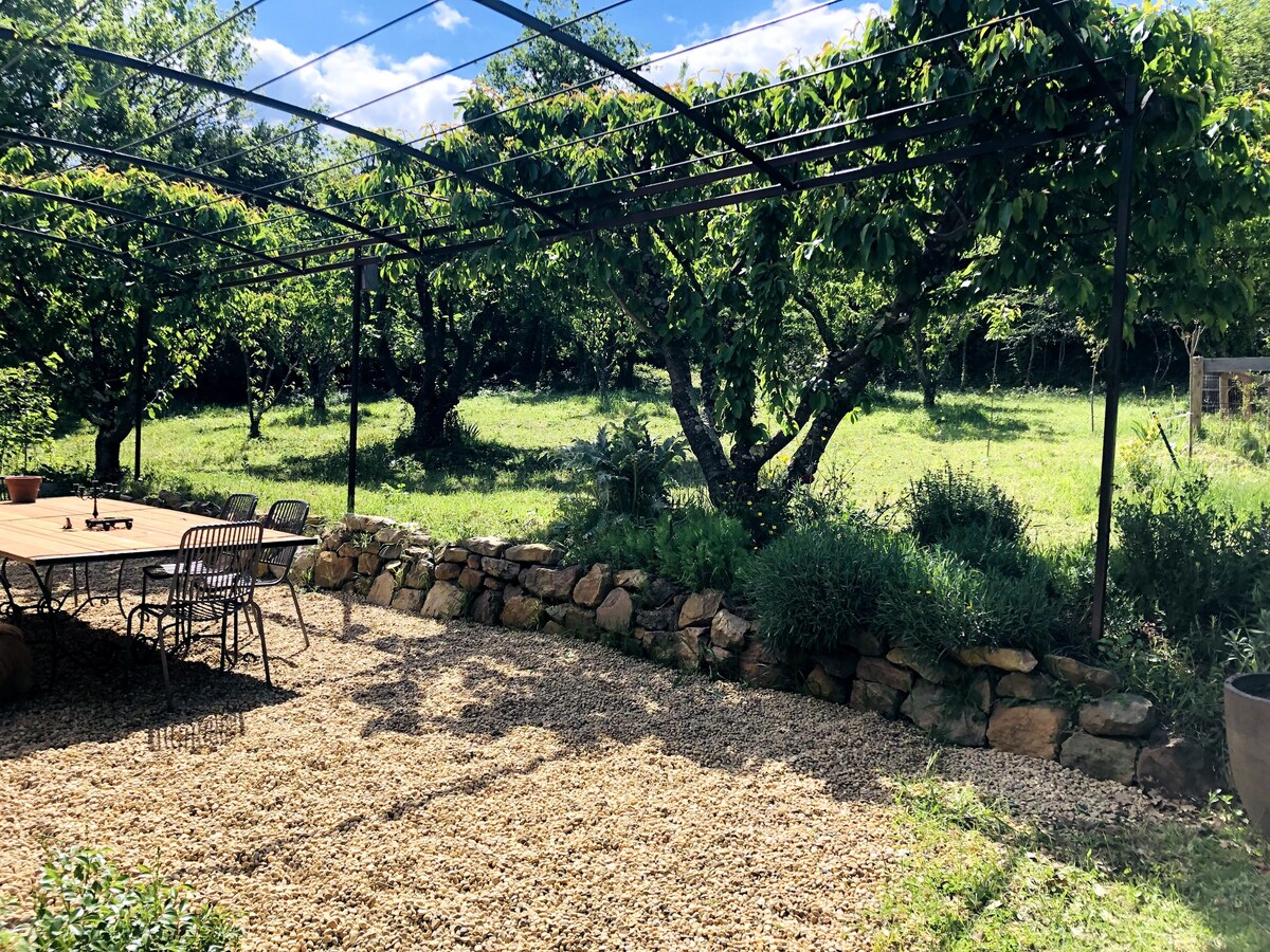 El Oasis, un lugar único para los amantes de la naturaleza en medio de un olivar de 1 hectárea entre Uzès y el pueblo de Collias. En esta pequeña casa de arquitecto de piedra de Vers con su terraza privada totalmente autónoma, electricidad solar y pozo, encontrará paz y tranquilidad. Por la mañana, los pavos reales vendrán a saludarte y desearte un buen día. El Gardon y el Alzon al lado para bañarse y una piscina compartida con nosotros, le refrescarán los días de verano