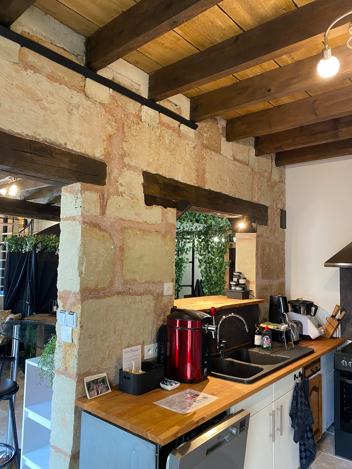 Casa en el centro de la ciudad de una sola planta de 50 m2 con entrada privada. Una gran sala de estar con cocina abierta y totalmente equipada (nevera, microondas, cafetera, hervidor de agua, placa de inducción, tostadora, plancha), sofá cama de 2 plazas ( 140) o 2 camas supletorias (90x190), zona de TV y sala de estar. 1 habitación con cama de matrimonio (140) Cuarto de baño, aseo privado separado Aparcamiento privado. Espacio exterior con muebles de jardín Se proporcionan sábanas, edredones, almohadas... Traiga sus artículos de aseo.