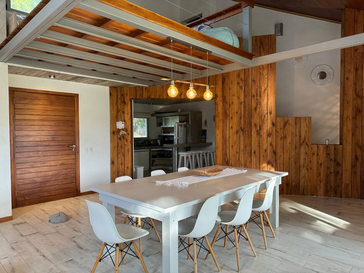 Casa playera, muy cálida y cómoda. Con la calidez de la madera. Luminosa. Facil de ordenar y limpiar. Muy cercana al mar. Con pileta cercada Tiene tres dormitorios en planta alta. el principal con cma doble,baño privado, vestidor, aire frio calor. los otros 2 de dos camas , comparten un baño completo. El cuarto dormitorio o dependencias de servicio, ubicado debajo del living, entrada por el exterior .Tiene un baño completo y aire acondicionado frío calor. La casa no tiene ropa blanca