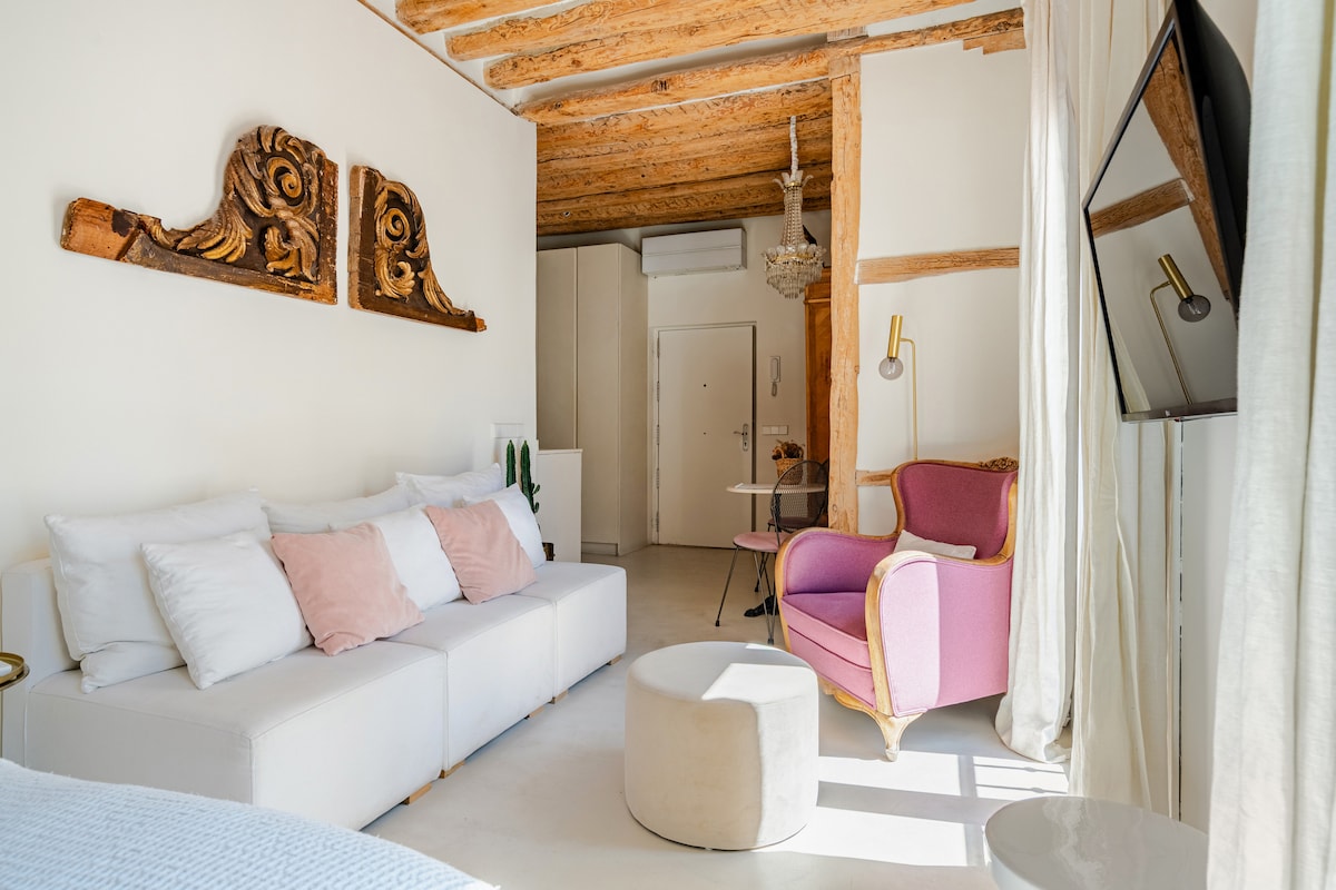 Luminoso y acogedor loft en el corazón de Malasaña, uno de los barrios más vibrantes y creativos de Madrid. Con 40 m², techos altos y vigas de madera vistas, ofrece un ambiente cálido y con personalidad. Cuenta con cocina equipada, zona de estar con sofá, cama muy cómoda y baño tipo wet room, un espacio integrado con ducha, lavabo e inodoro. Fue mi estudio fotográfico, hoy reconvertido en un lugar único, ideal para escapadas en pareja.