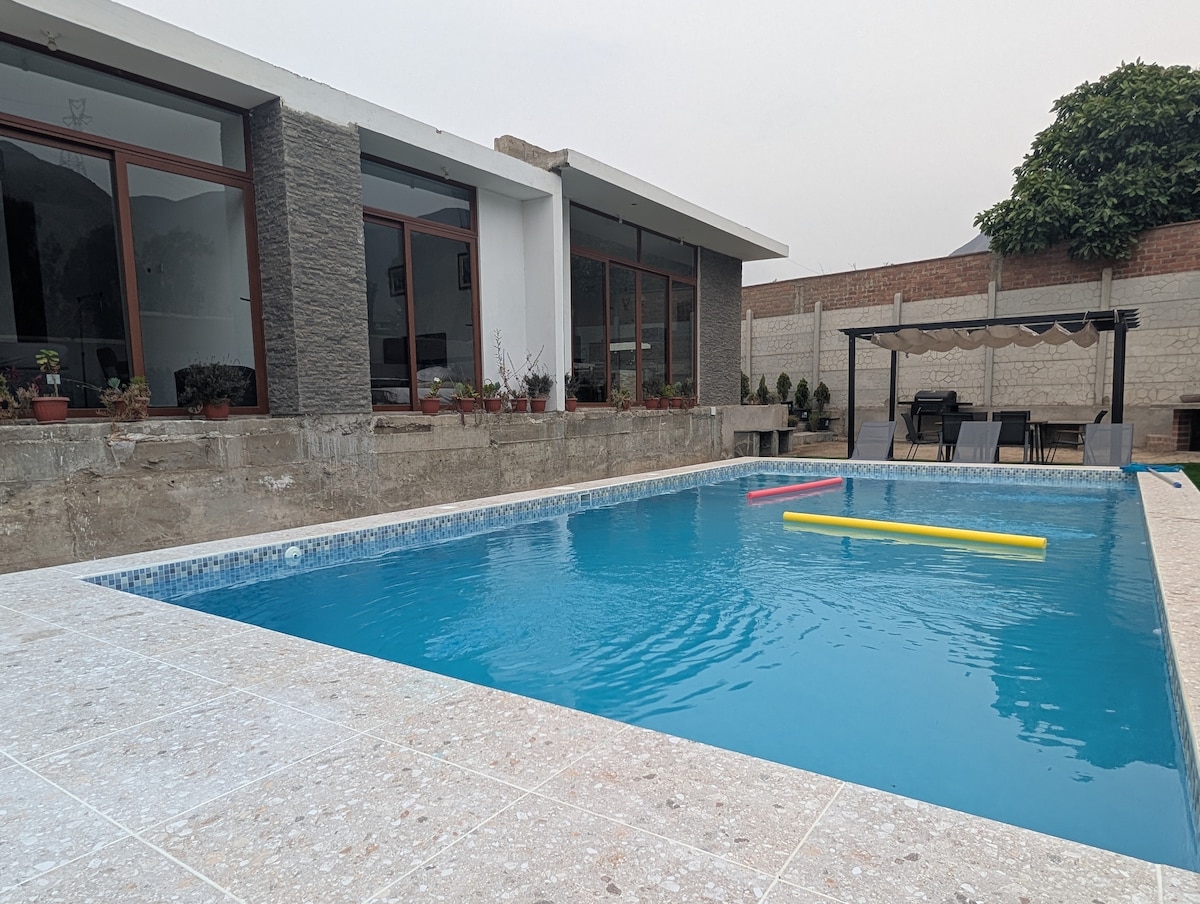 Casa amplia y acogedora. Tiene lo que necesitas para poder pasar un fin de semana increíble con tu familia, amigos y mascotas. Escápate de la ciudad y disfruta de un paisaje hermoso cerca al Río Lurín. La casa tiene 2 bungalows independientes, en total cuenta con 2 piscinas, 4 cuartos, 2 baños completos, 2 cocinas totalmente equipadas, 2 parrillas, 2 cajas chinas, 1 horno de barro, 2 duchas exteriores, jardín.