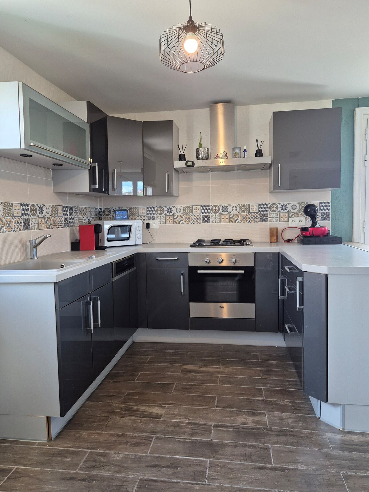 Esta es nuestra nueva casa de campo de 3 dormitorios en el alojamiento. La cocina es totalmente funcional y espaciosa. Dos anillos de inducción de cocina están en funcionamiento. También encontrarás un lavavajillas y una cafetera + una caldera de agua. La sala de estar tiene muebles básicos pero cómodos. La casa de campo incluye una entrada privada y un jardín. La piscina y el terreno se comparten con otros huéspedes. La propiedad no es a prueba de bebés/niños.