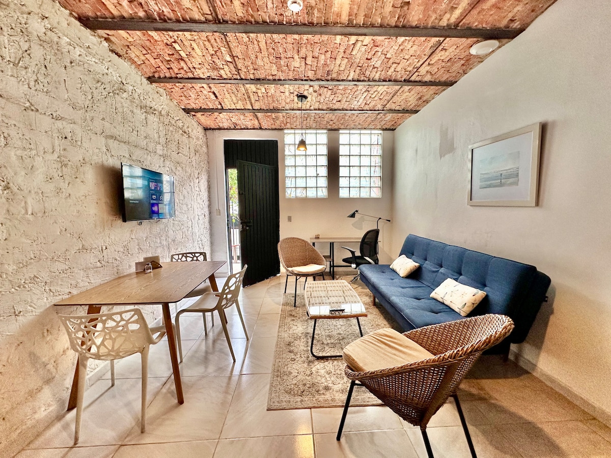 Hermoso Loft muy cerca del centro de Tlaquepaque donde encontrarás experiencias culinarias, culturales, amenidades y vida nocturna, a unos minutos caminando del tren que conecta toda la ciudad. El Loft cuenta con Aire acondicionado en habitación, área de cocina y sala, cuenta con ducha de lluvia de alta y media presión, cerradura digital, pantalla 4K, internet de alta velocidad 210 Mbps, y sensor CO2. No cuenta con cochera Disfruta de una experiencia con estilo en este alojamiento céntrico