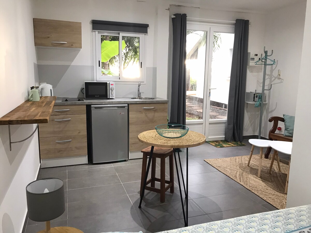 Estudio en dos plantas. En la planta baja salón / comedor y baño. En el exterior encontrará una cocina equipada con lavadora a su disposición. Arriba, un gran dormitorio con aire acondicionado con armarios y un escritorio. La cama tamaño king está equipada con una mosquitera. Todo en un gran jardín arbolado con piscina. Estamos a 5 minutos del aeropuerto. (Para los traslados, pregúntanos por mensaje) Os esperamos!