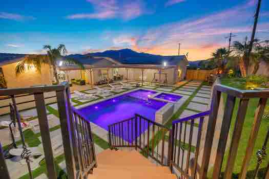 Bienvenido a Palm Peach, una fiesta en el desierto inspirada en Wes Anderson llena de colores y personajes, perfecta para 8 huéspedes. Toma el sol en tumbonas hechas a mano junto a la piscina en un patio trasero estilo resort. Sumérgete en la gran piscina de agua salada. Disfruta de un spa caliente bajo las estrellas. O reúnete alrededor de la chimenea para evitar los escalofríos. Experimenta una sala de juegos y teatro con luz negra única con un mural de luz negra, una mesa de billar de 8 pies, karaoke, juegos de Los Simpsons y mucho más.