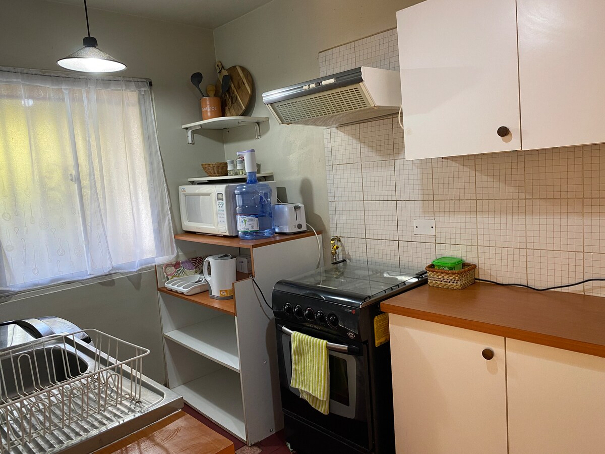 Our guest suite, ideal for singles or couples, is independent from our house and has a private entrance. The guest suite has a modern exterior and a comfortable interior. Our house is located on an old family farm near the beach (1.5 blocks to the beach). Our location is close to several beachside restaurants and bars. The little kitchen has a toaster oven, microwave, electric kettle and frigobar (small fridge) but does not have a cooktop. No es apropiada para niños menores de 7 años.