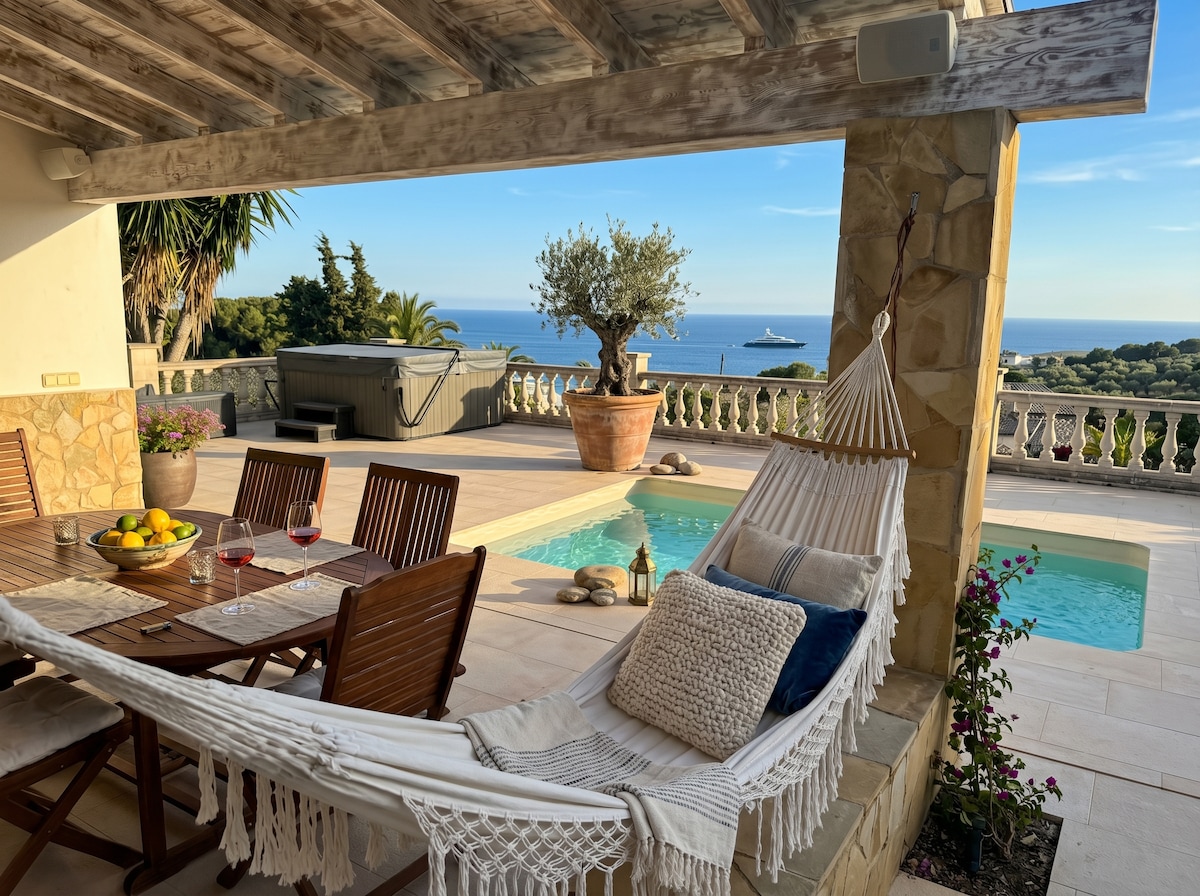 Blueview's Villa esta orientada al sur y ofrece unas vistas impresionantes al Mar Mediterráneo. Esta villa tiene una ubicación inmejorable muy cerca de la playa y del centro. Blueview dispone de 5 dormitorios con vistas al mar y muy espaciosas. Ideal para reuniones familiares y ocasiones especiales entre amigos. La terraza esta acompañada de una piscina infinita que refleja el azul del mar, jardin y mobiliario para disfrutar de un buen descanso y de la naturaleza.
