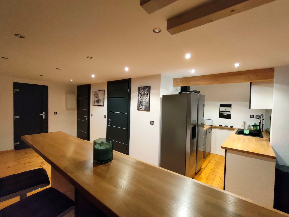 En La Vancelle, un pueblo ajardinado en medio de las montañas, un tranquilo oasis residencial, entre Estrasburgo y Colmar, una gran cabaña de lujo en una casa diseñada por un arquitecto de 1929. Magníficas vistas de la montaña y del castillo de Haut-Koenigsbourg. Pequeña terraza con cenador en el jardín. Magnífico entorno natural a pocos minutos de la ruta del vino. ¡Ubicación estratégica para viajar fácilmente por Alsacia e incluso cerca de Alemania! Fácil acceso en todas las estaciones (vehículo esencial).