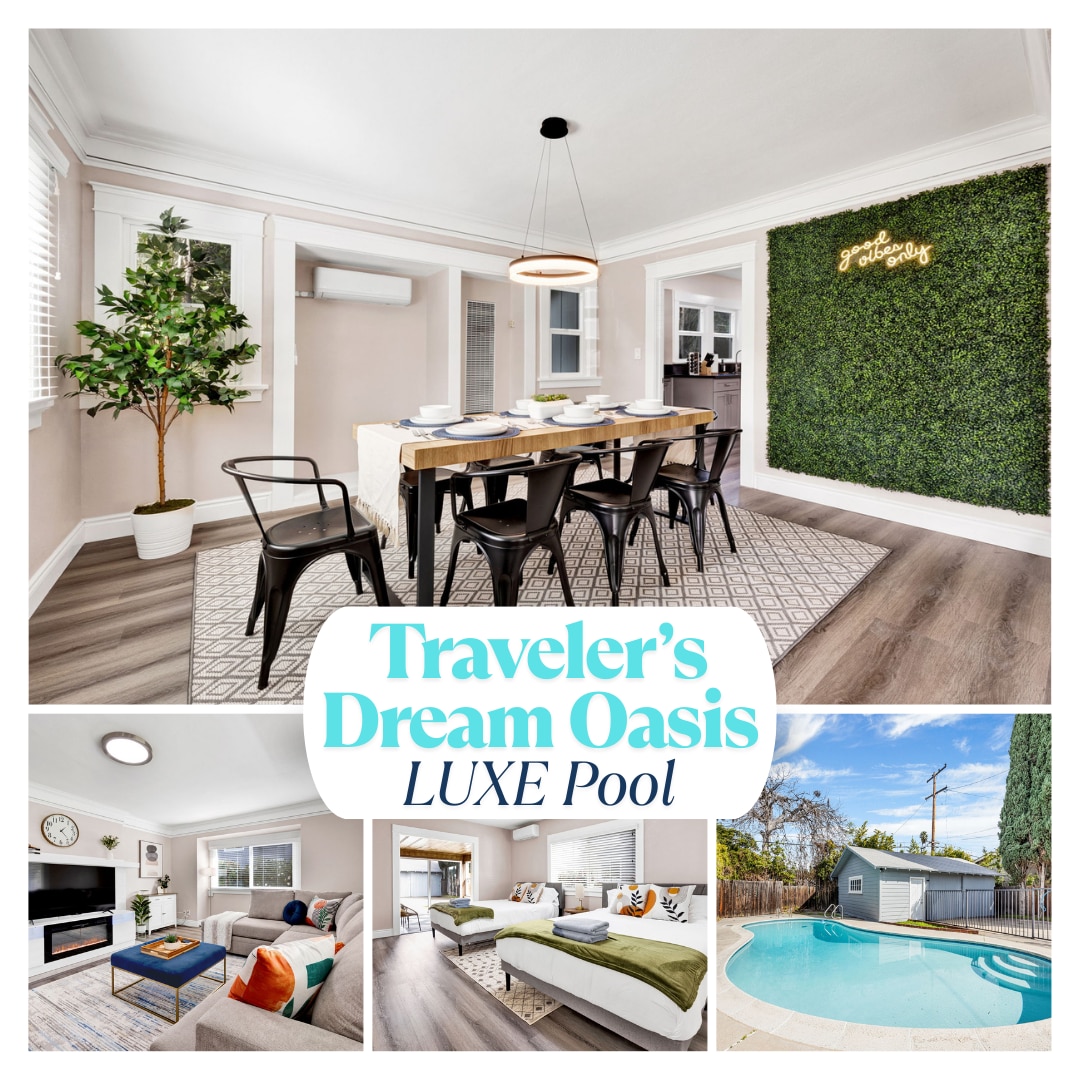 Preciosa casa de 3 dormitorios/2 baños de un solo piso con PISCINA PRIVADA climatizada que se siente como un centro vacacional de 5 estrellas con carga GRATUITA de EV para tu automóvil. Hermoso patio trasero, parrilla y salón de 12 plazas, piscina y bañera de hidromasaje con tobogán de agua. Chimenea, TV OLED de 85", espacio de trabajo, wifi de alta velocidad, gimnasio. Cocina totalmente equipada, cocina de gas de 6 quemadores, arrocera, cafetera, etc. Lavadero con lavadora, plancha, aire acondicionado, calefacción, ropa de cama, toallas, mochila y juegos. Cerradura digital de la puerta, entrada para 4 vehículos.