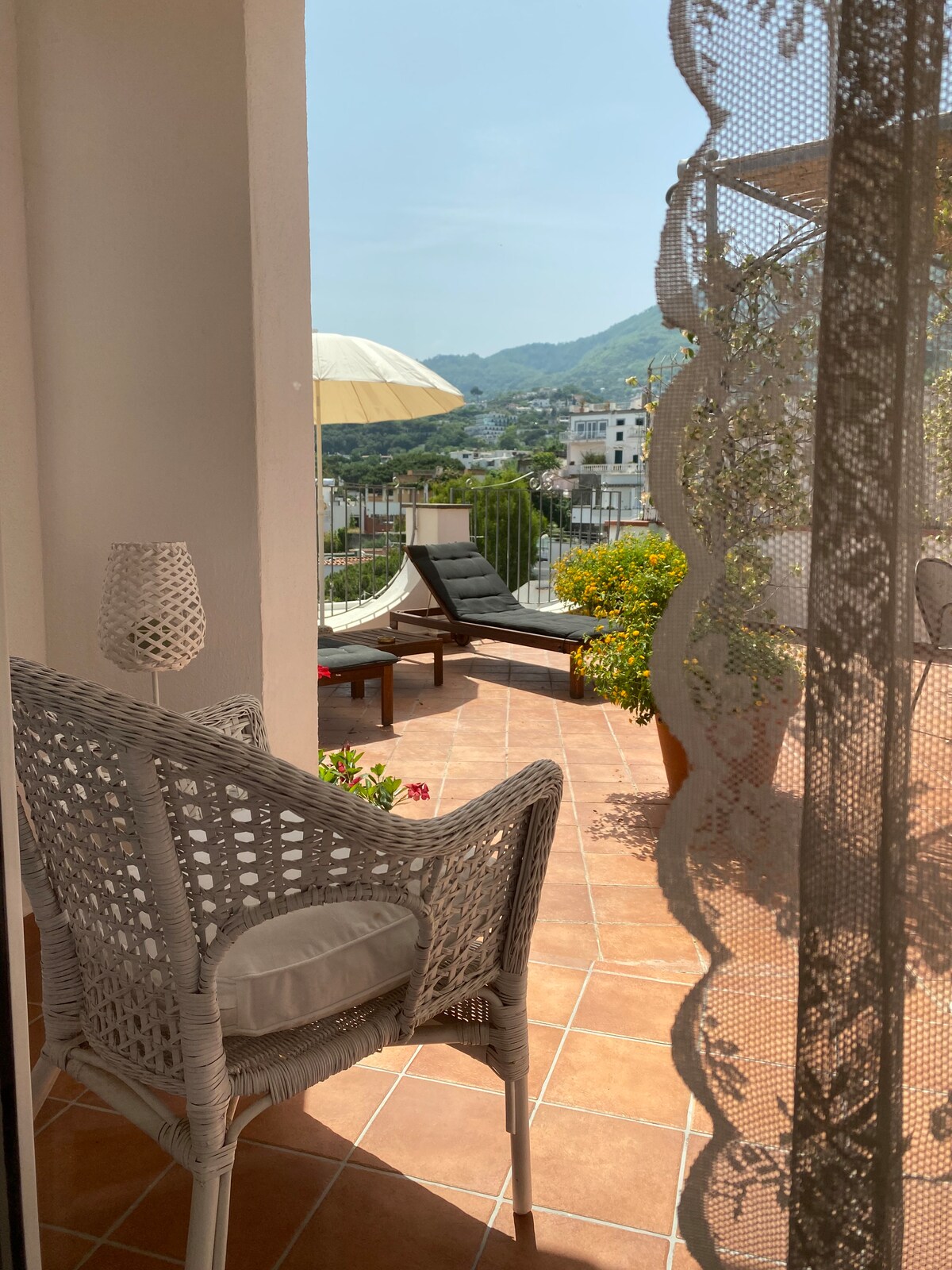 A solo 100 metros del Fungo y del centro de Lacco Ameno En el primer piso es luminoso, decorado con cerámica típica y recientemente completamente renovado. Está compuesto por: - una primera habitación doble con vistas a la montaña, - un segundo dormitorio con dos camas individuales que se pueden unir, - dos baños con ducha, - una sala de estar con sofá cama, - cocina con placa de inducción, - 3 terrazas con vistas al mar y a las montañas.