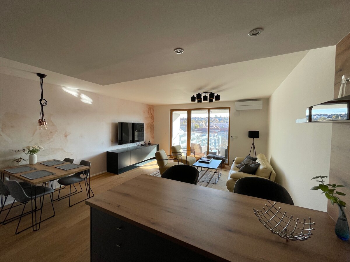 ¡Bienvenido a nuestro EXQUISITO apartamento en la azotea en el corazón de Praga! Este elegante y espacioso refugio ofrece 4 hermosos dormitorios, con capacidad para hasta 12 huéspedes, lo que lo convierte en la opción perfecta para un grupo o unas vacaciones familiares grandes. Experimenta la MAGIA de Praga con una vista de 360° desde nuestra enorme terraza, donde puedes sumergirte en el impresionante panorama de la ciudad. Mantente fresco y cómodo con nuestro sistema de aire acondicionado de primera categoría. Nuestro espacio ELEGANTE y MODERNO promete una estancia INOLVIDABLE.