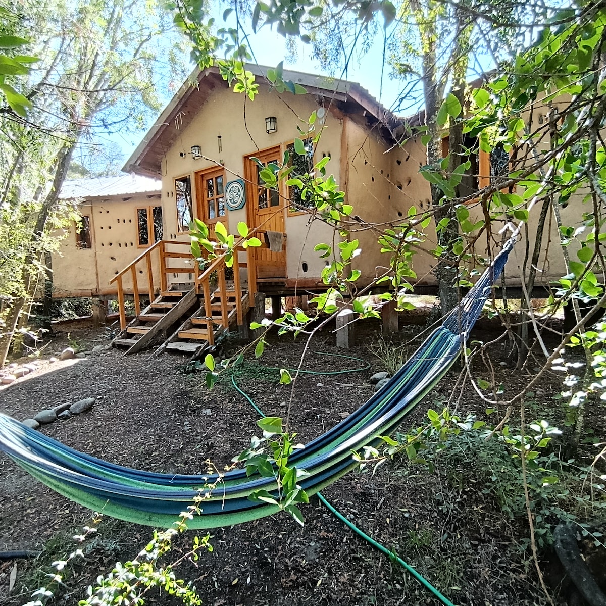 Acogedora casa de barro en el Cerro Amigo, a pocos metros del centro y con la tranquilidad de la montaña, con panorámica vista hacia el valle y la cordillera. Está ubicada en un predio de más de una hectárea compartido con otras cabañas, en el cual cada una tiene un amplio espacio de privacidad y descanso.