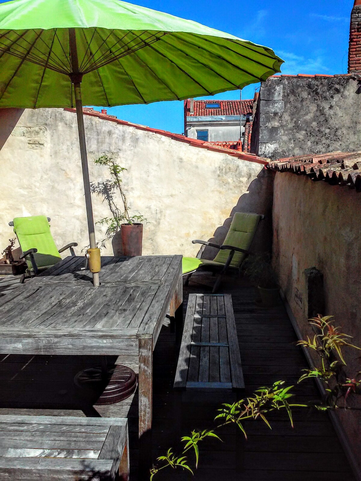 a dos pasos del mercado cubierto de La Rochelle, en el corazón del casco antiguo histórico con sus tiendas, restaurantes y bares ... casa atípica de 150 m2 en dos plantas, hermosos volúmenes, con terraza de 25 m2 con vistas a los tejados y gran garaje.