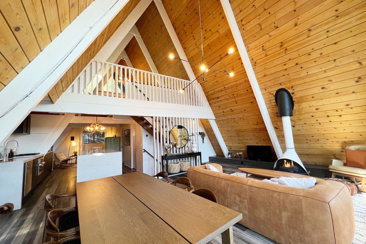 “The Avian” is a 2 bedroom A-frame with king size bed in the loft with a 1/2 bath. The 1st level bedroom has a queen & twin loft bed. Both bedrooms are equipped with AC, blackout curtains, comfortable bedding, additional blankets/pillows and fans. The living room has a wood burning fire place, 4K TV, Record & Bluetooth player, Apple TV, Acoustic Guitar, Blankets and Board Games. Other Amenities include Central Heat, W/D, parking, Hot Tub, outdoor gas fire pits, gas grill and outdoor seating