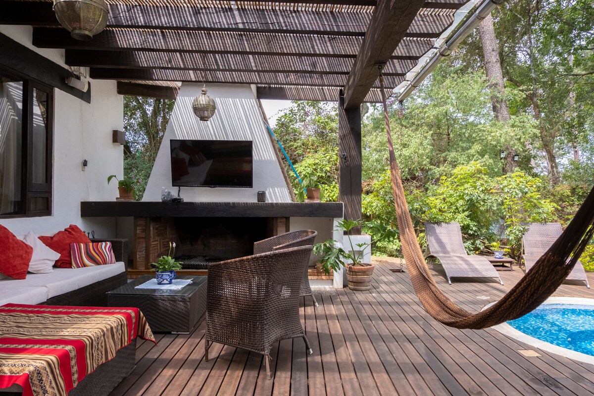 Tu nuevo hogar en medio del bosque, con alberca propia climatizada, jardín, fogatero y jacuzzi, ninguna amenidad se comparte, ni tiene costo extra a tu llegada. Incluido en el precio: limpieza y preparación de alimentos (Solo fin de semana). NO ESTÁN PERMITIDAS FIESTAS Cuenta con 4 habitaciones , terraza, asador, jardín, comedor al aire libre y fogatero. Estamos en un pequeño condominio de 10 propiedades a 5 minutos en vehículo del parque natural Cascada Velo de Novia.