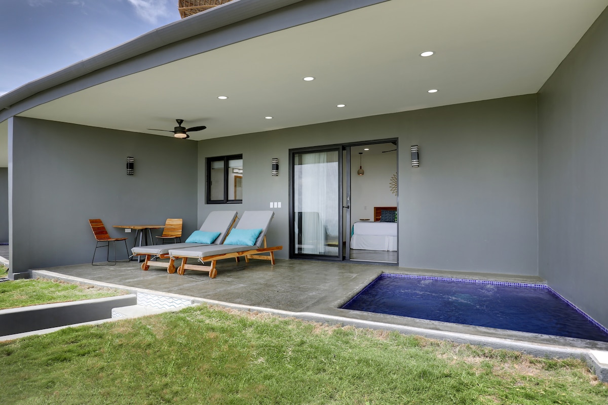 Este espacioso bungalow de un dormitorio con cama tamaño queen, bañera y ducha, ofrece lujo y privacidad en un entorno natural romántico. El bungalow tiene su propio patio privado con piscina profunda donde los huéspedes pueden disfrutar relajándose y admirando la belleza que rodea la villa. Se utiliza una escalera para acceder a esta villa y puede no ser adecuada para huéspedes con problemas de movilidad. 1000 pies cuadrados.