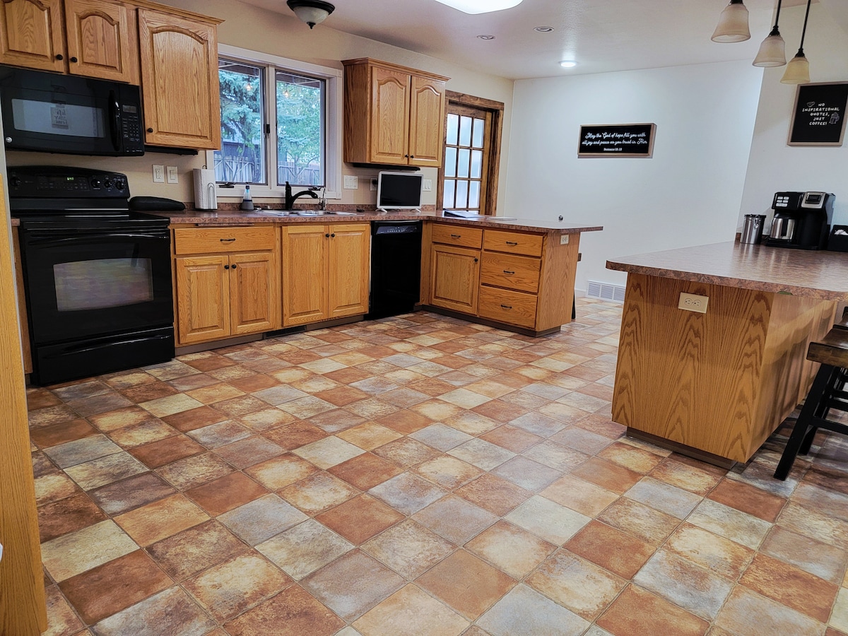 Disfruta de esta espaciosa casa de 334 metros cuadrados en un patio de 0,25 hectáreas, que combina la tranquilidad del campo con la comodidad de la ciudad. Capacidad para 12 personas cómodamente con 4 dormitorios (6 camas) y 4 baños. Futón, cuna y sofás también disponibles. Los perros son bienvenidos. El patio trasero vallado cuenta con un trampolín perfecto para los niños. Ubicado a solo 4 cuadras del centro recreativo, a 3 minutos de restaurantes y a 35 minutos de Medora y Badlands.Una ubicación de escapada perfecta para todos. Vacaciones, caza o pesca, este es el lugar para ti.