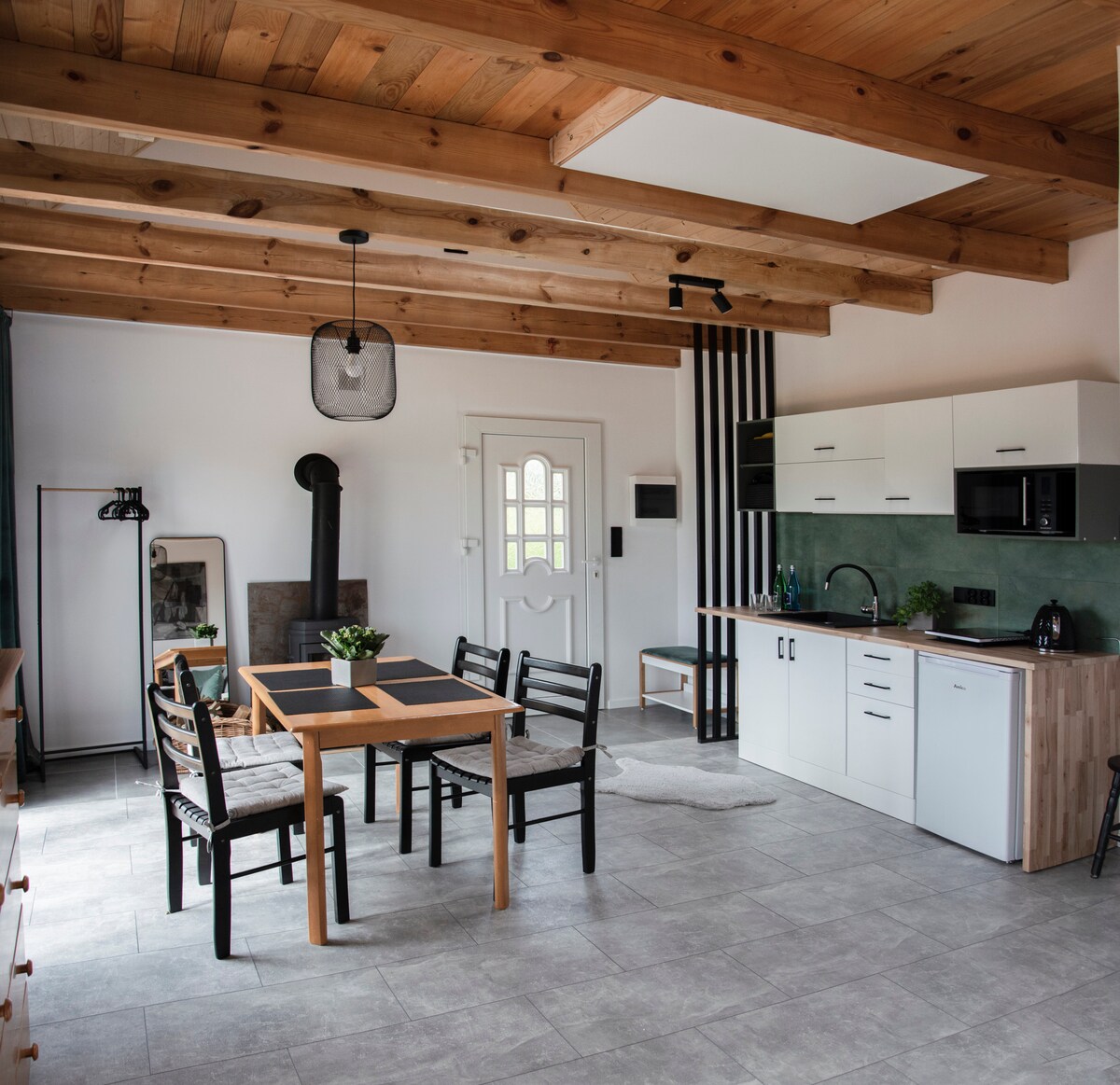 El precio de la estancia incluye acceso ilimitado al jacuzzi y a la sauna. Casa de campo Wabi Sabi para un máximo de 4 personas en el bosque junto a un lago en Casubia. Ofrecemos una casa de dos plantas de unos 45 m2 con dos dormitorios separados, una sala de estar común con zona de cocina, comedor, baño y una gran terraza rodeada de bosque. La parcela en la que se encuentra la casa tiene unos 500 m2 y está vallada. Además, en la gran terraza de madera tenemos un jacuzzi y una sauna solo para los huéspedes de la casa. Nuestra casa es para todo el año, tiene calefacción y una estufa. El lago Sudomie está a 150 m.