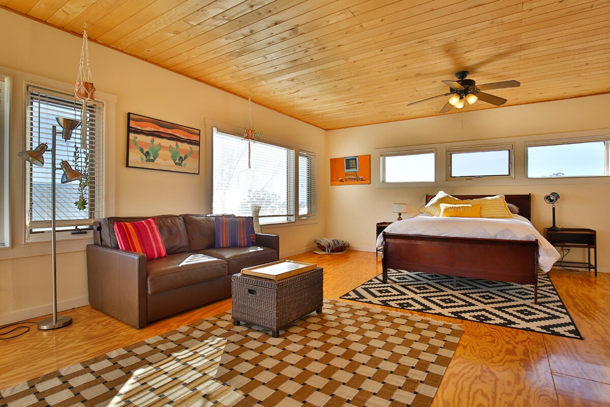 Dulce y soleado estudio de 1 habitación en el lado norte de Taos, bordeando el Bosque Nacional con jacuzzi bajo las estrellas. Excelentes vistas en 3 lados con acceso inmediato a kilómetros de ciclismo y senderismo en senderos y carreteras de servicio forestal. A 30 minutos de Taos Ski Valley y Red River. Un gran lugar para escapar. Ropa de cama orgánica y productos de limpieza. Aire acondicionado y ventilador de techo por si hace calor en verano. Internet de fibra óptica en caso de que tengas que trabajar en las vacaciones. Cargador para vehículos eléctricos de nivel 2. HO-51-2022