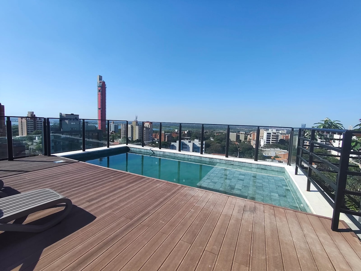Departamento súper equipado en zona residencial, con balcón y parrilla, hermosa vista y amenities premium: - Piscina con solarium - Piscina climatizada - Sauna - Gym en altura - Rooftop + Quincho - Laundry - Seguridad 24hs - Cochera Excelente ubicación: - A 7 minutos del Eje Corporativo, Shopping del Sol y Paseo La Galería - A 10 minutos de la Costanera y el Puente Héroes del Chaco - A 15 minutos del Aeropuerto Silvio Pettirossi Cuenta con Wi-Fi, Smart TVs y colchones firmes de alta densidad