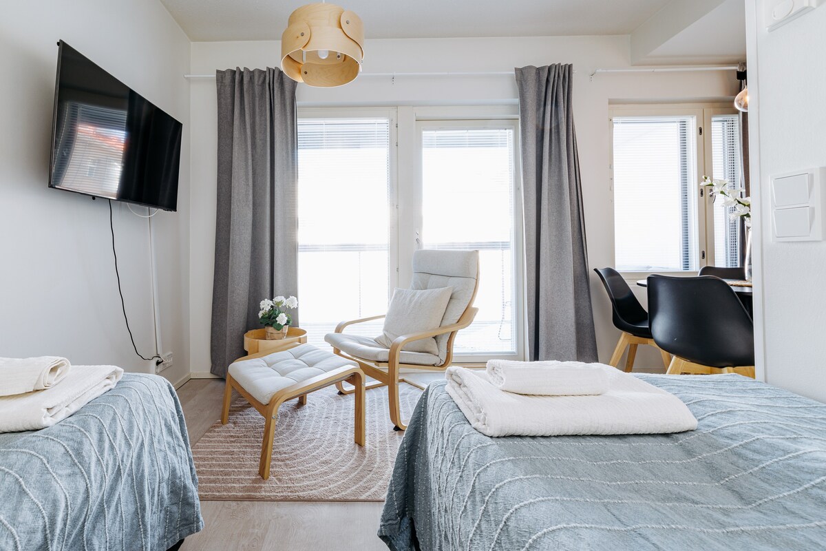 Nauti tyylikkäästä majoittumiskokemuksesta tässä keskeisellä paikalla sijaitsevassa kohteessa. Kaikki keskustan palvelut sekä rautatieasema kävelyetäisyydellä. Huoneistossa on kaksi erillistä makuuhuonetta, joista toisessa työskentelypiste, keittiö kuuden hengen ruokailuryhmällä, kylpyhuone saunalla sekä olohuone, jossa levitettävän sohvan lisäksi daybed. Vieraiden käytössä on yksi maksuton autopaikka, pyykinpesu- ja kuivauskone, Wifi-yhteys sekä Smart TV Netflix-tunnuksilla.