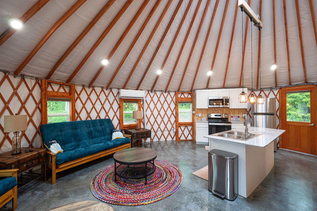 ¡YURTA de 30 pies con un loft y todos los lujos de un hogar (incluyendo CALEFACCIÓN y AIRE ACONDICIONADO)! Este espacio único está situado en nuestra granja de 50 acres con kilómetros de senderos y mucha privacidad. ¡Esta no es una tienda de campaña ordinaria! Esto es glamping en su máxima expresión con una cocina completa, fontanería regular, control del clima y todas las comodidades de un hogar. Ten en cuenta que lo anunciamos como 2 dormitorios, pero el segundo dormitorio es una zona loft abierta y no privada. ¡Te encantará tu estancia en la MEGA YURTA de Maggie!