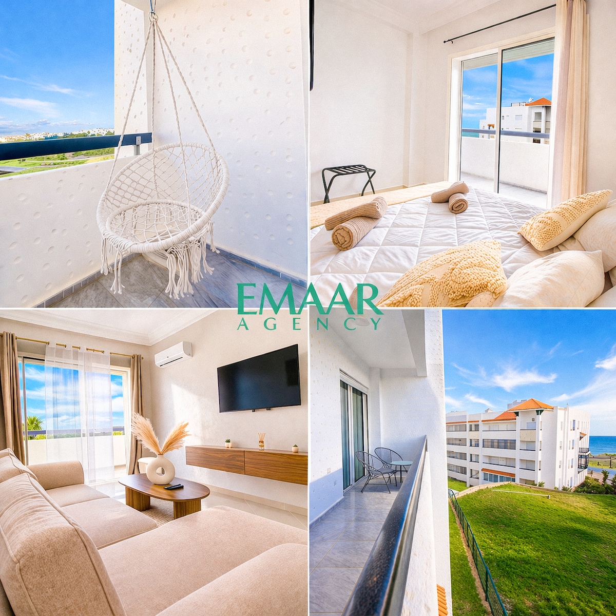 ✨Un remanso de paz en Tánger con vistas al mar ✨ Disfruta de una estancia refinada en nuestro apartamento OCÉANA, un entorno excepcional con vistas panorámicas al mar y a la piscina. Disfrute de un amplio jardín y una piscina privada y, cada noche, déjese maravillar por una espectacular puesta de sol en el horizonte marino. A 5 minutos de la playa y a 13 minutos del aeropuerto, con aparcamiento privado gratuito y vigilancia nocturna, para una estancia tranquila y un confort óptimo.
