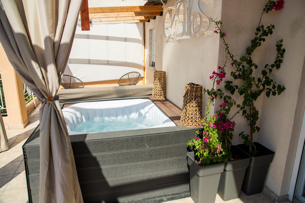 Una estancia especial con vistas ilimitadas a la plaza. En la gran terraza de 100 m² podrás relajarte disfrutando del jacuzzi climatizado, la pantalla gigante de 150'' para una experiencia cinematográfica, la barbacoa y el comedor para seis personas con vistas a la plaza de Ag. Konstantinou. Tiene una sala de estar con un sofá cama y un dormitorio separado, puede alojar hasta 4 personas. 2 televisores inteligentes de 40'' con Netflix/YouTube. En el 4.º piso (el ascensor sube hasta el 3.º y hay que subir un piso)