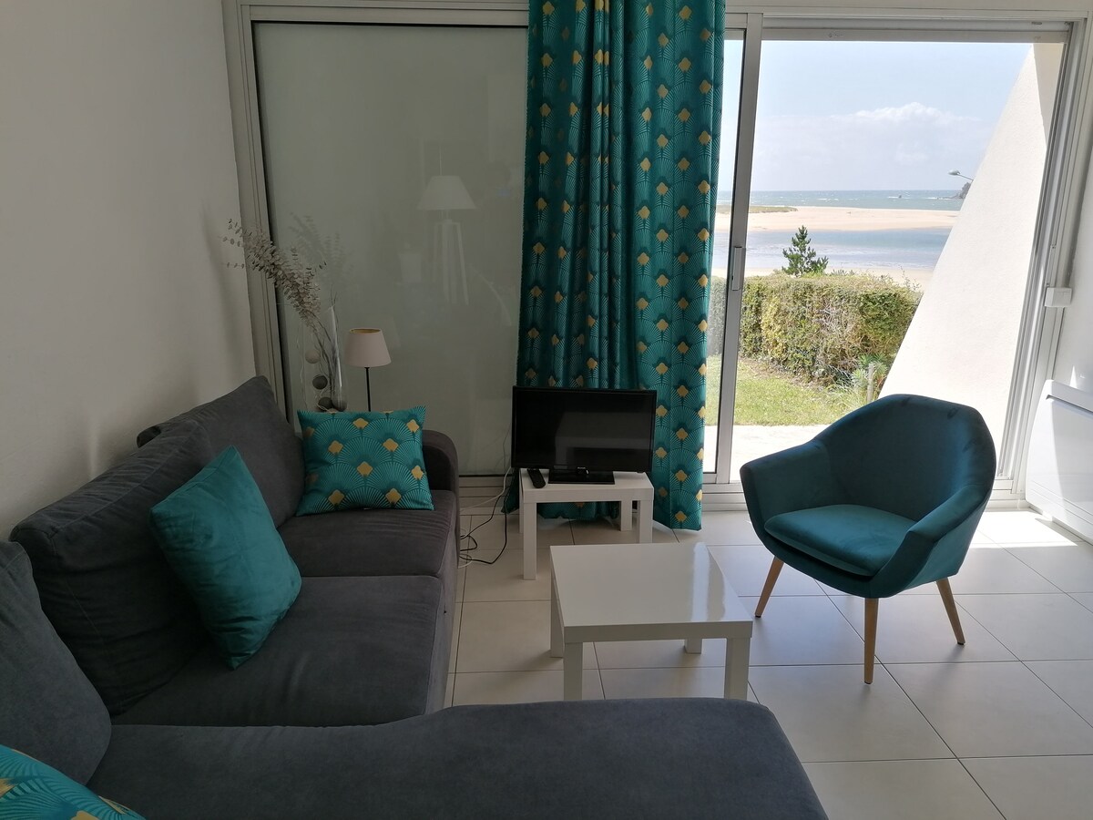 Pequeño apartamento en la planta baja del jardín en residencia frente al mar, clasificado como amueblado de turismo**. Está totalmente equipado para funcionar de forma autónoma. Se proporcionan sábanas y toallas de forma gratuita y ofrezco café, tés, chocolate e infusiones. Delante de la entrada, un pequeño jardín privado rodeado de setos y una plaza de aparcamiento en la urbanización. En las inmediaciones: playa frente a la residencia, senderos costeros, carril bici, golf, restaurantes. Panadería a 2 km. Supermercado a 4 km.