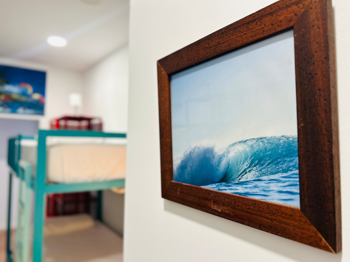 Habitación MIXTA de 6 camas con baño compartido en surfhouse/coliving de 4 plantas. A 1 minuto caminando de la playa de las Canteras. Ambiente dígital nómada y surfero, disfruta de tu privacidad a la vez que conoces a gente como tú. Bienvenid@ a un grupo de amig@s que cuidan de la casa con positive vibes, donde practicamos deporte y nos divertimos con unas cervezas. Somos instructores titulados de KITESURF y SURF. Unete a un nuevo estilo de vida!