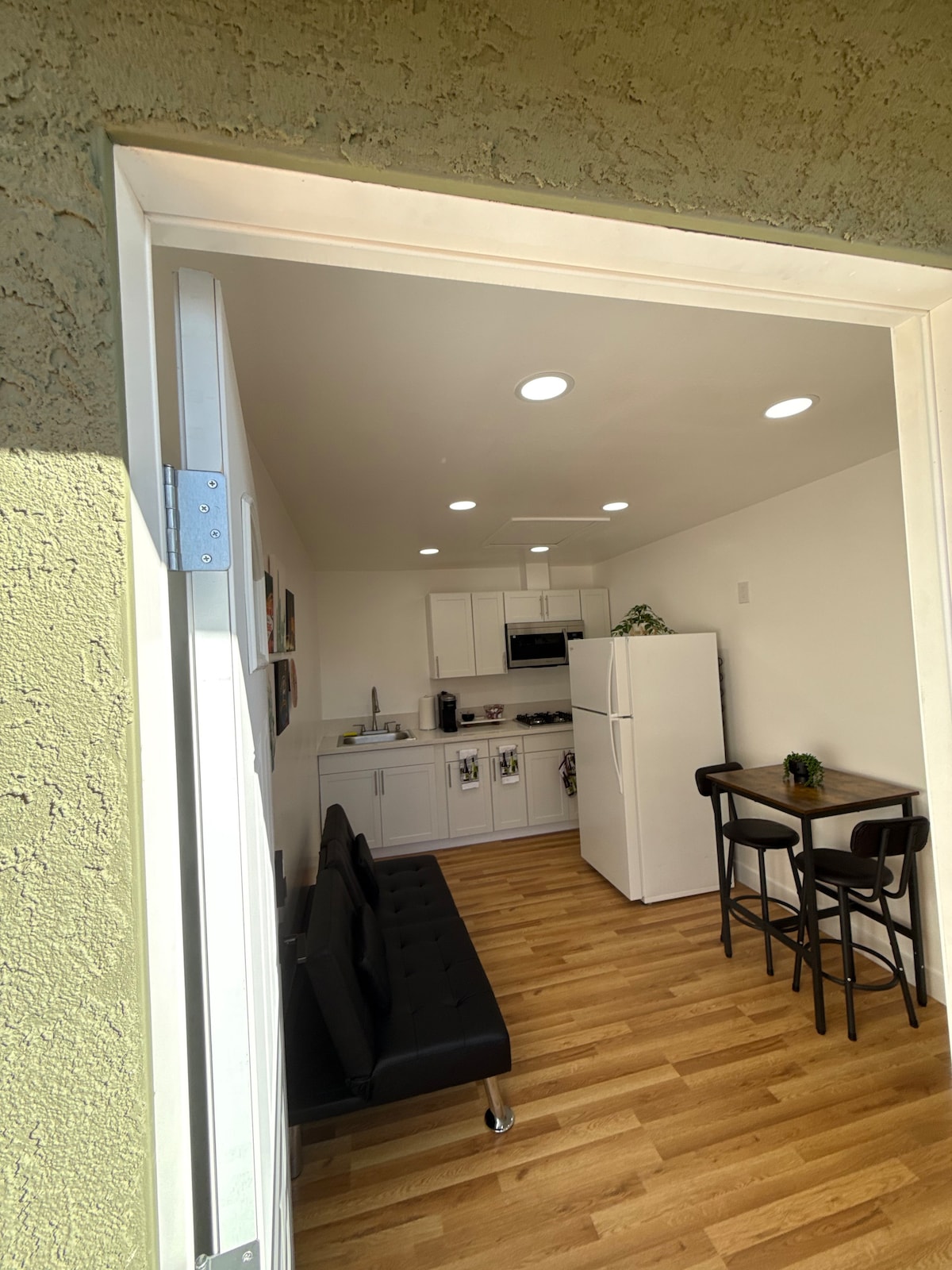 luxurious studio with private entrance, all decorated in black and white colors, has a kitchen with all kitchen accessories, queen bed, folding bed for another additional person, tv , air and heating are individual for the rest of the house since the studio has a mini split installed, it has a smoking area outside